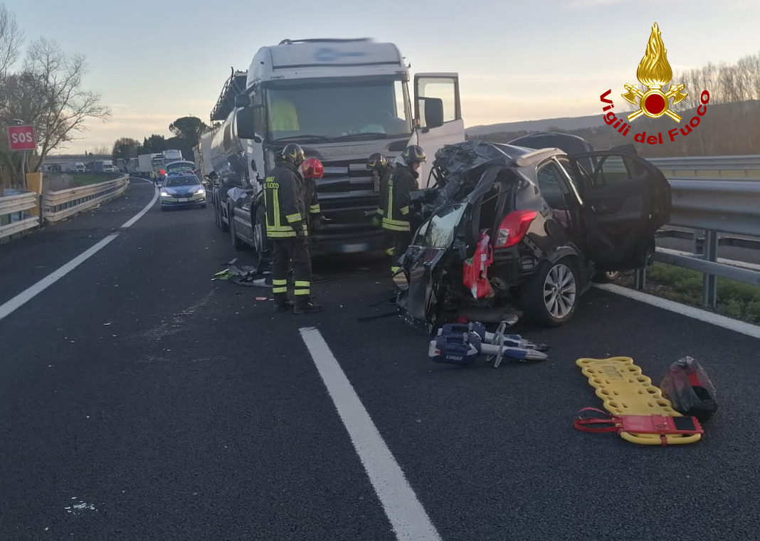 Incidente sull’Autostrada A1 corsia Nord Km 412+700, il sinistro ha coinvolto un mezzo pesante ed una autovettura. Sul posto i vigili del fuoco del comando di Siena, distaccamento di Montepulciano, che hanno estratto due persone estratte dall’abitacolo della vettura, poi prese in carico dai sanitari del 118 intervenuti anche con l’elisoccorso Pegaso.