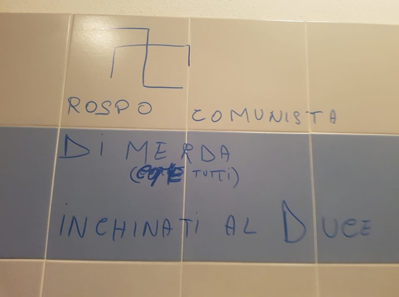 Una svastica, anche mal disegnata, e una scritta offensiva con richiami nazi-fascisti hanno segnato questo inizio di anno 2019 nella pacifica comunità di Castiglione d’Orcia nel centro della meravigliosa Val d’Orcia. Il tutto eseguito sulle mattonelle del bagno del bar Petra gestito da Maurizio Formichi, presidente della sezione ANPI di Castiglione d’Orcia e figlio di un partigiano, conosciuto e soprannominato “Rospo” da tutta la comunità valdorciana. E’ da questo soprannome che si collega la scritta vergognosa che si riferisce direttamente al castiglionese con chiari collegamenti alla celebrazione nazi-fascista: “ROSPO COMUNISTA DI MERDA (COME TUTTI), INCHINATI AL DUCE”.