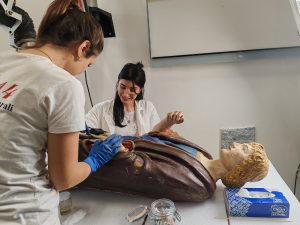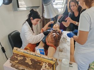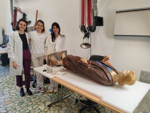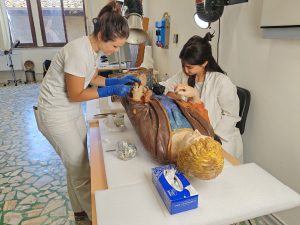 Giace come se dormisse sul tavolo di lavoro delle restauratrici, la scultura lignea che potrebbe raffigurare un santo martire, un giovane imberbe con i capelli riccioluti ridipinti di biondo e un incarnato olivastro dovuto forse ai viraggi delle vernici: “L’opera è datata tra il 1470 e i 1500, la veste ha delle ridipinture ad olio di lino attribuibili all’ottocento” nota la restauratrice Sofia Oliveti.