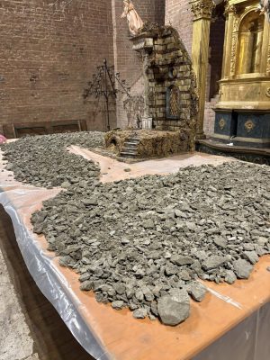 Non bisogna più scalare montagne per incontrare il Mistero. Se in passato, secondo la tradizione biblica, profeti e patriarchi come Mosè e Isaia dovevano salire in alto per avvicinarsi a Dio, oggi il divino si fa prossimo, scende tra le persone e si lascia contemplare all’altezza di ogni sguardo. È questa l’idea che anima il presepe allestito dai frati di San Domenico a Siena, quasi pronto per essere ammirato da fedeli e visitatori. Un’anteprima svela già l’originalità della scelta: la scena della Natività poggia su frammenti di terra delle crete senesi, le tipiche argille dal colore azzurrino che caratterizzano il paesaggio attorno alla città. Questi materiali locali non sono solo una scelta estetica, ma assumono un significato simbolico preciso: rappresentano il cielo che si fa terra, il divino che si rende accessibile.