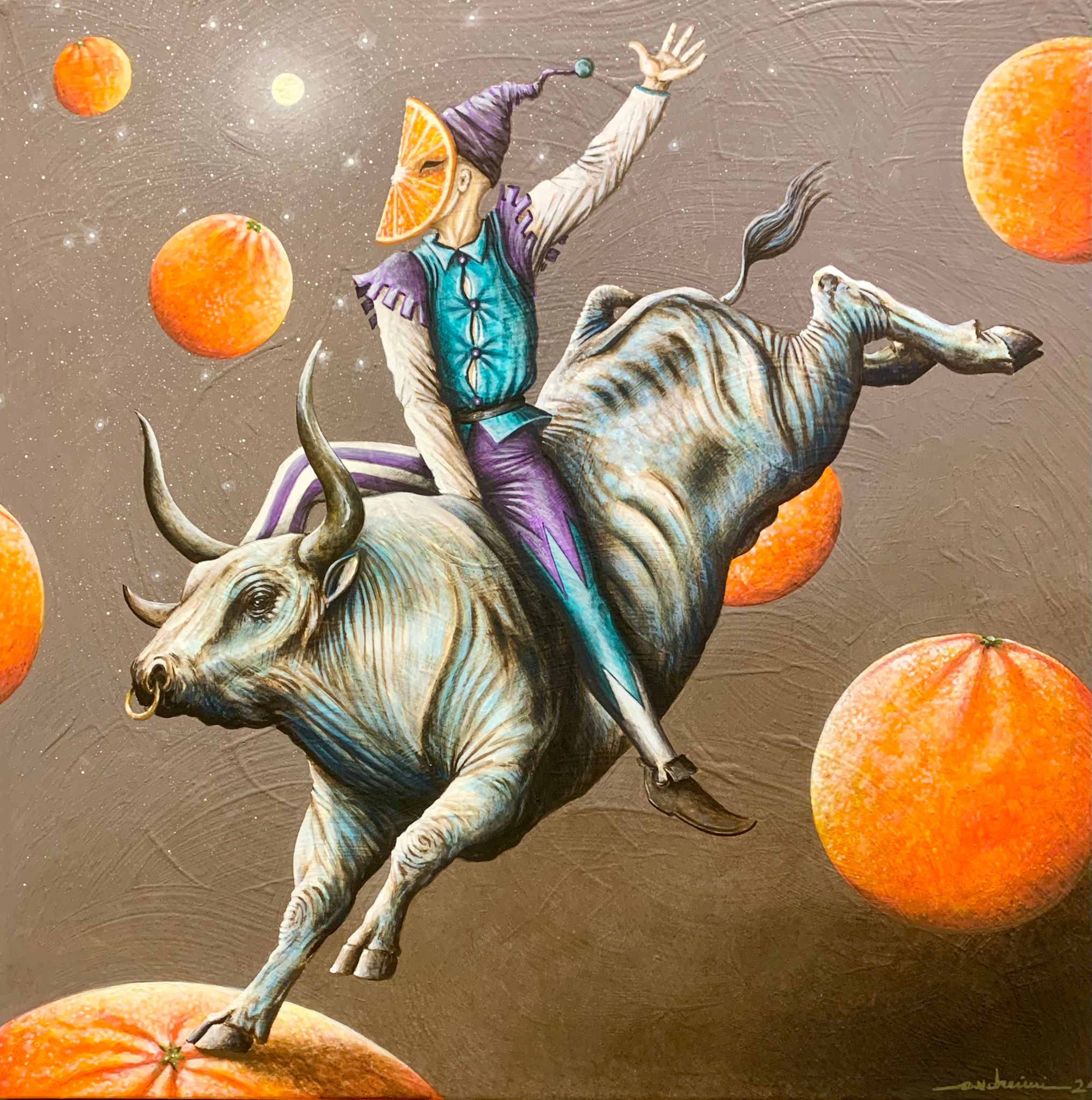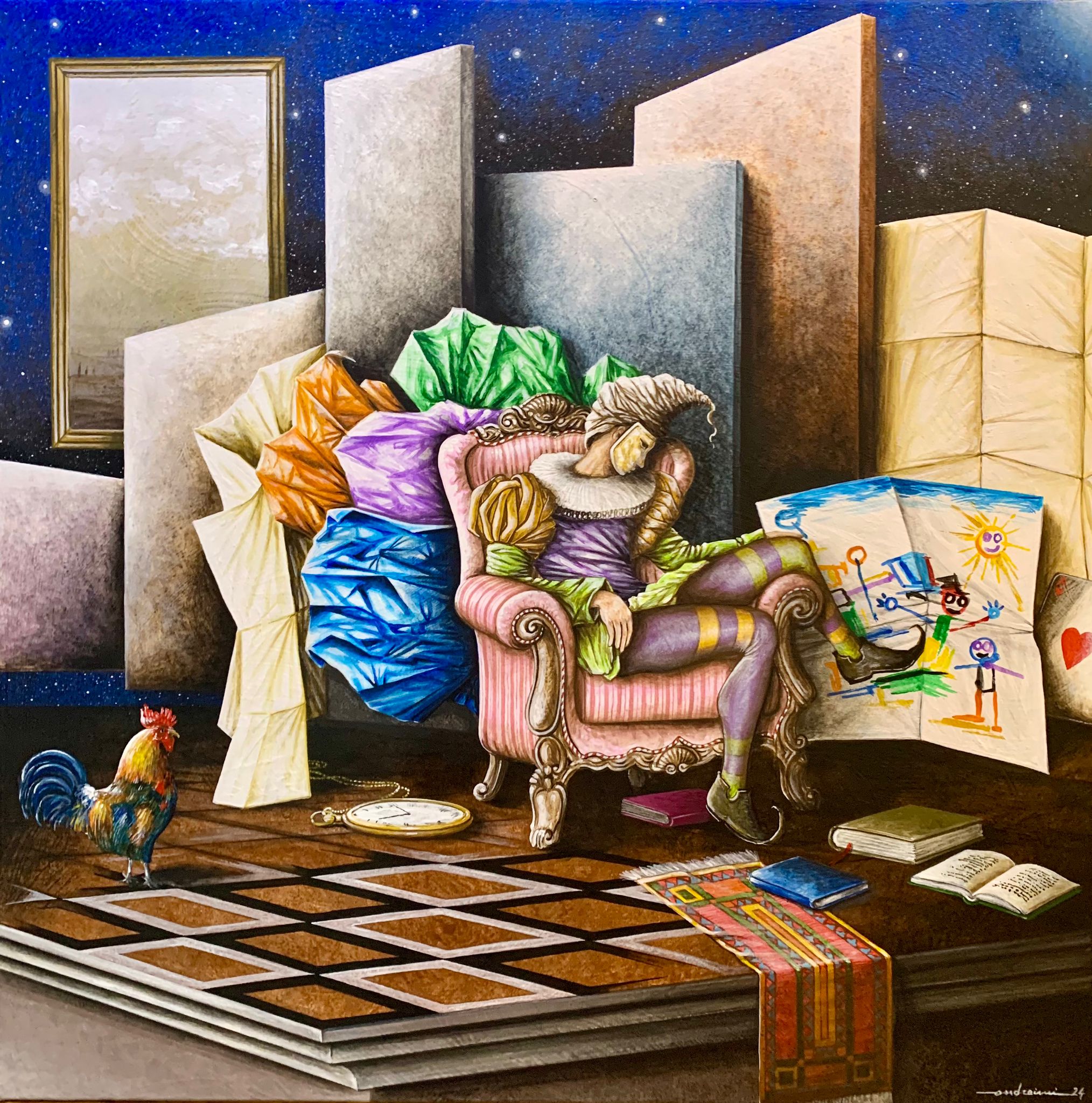 “Ho giocato un po’ con il modo di dire ‘quadratura del cerchio’ quando si individua la cosa giusta – ha spiegato Andreini in diretta a ‘Buongiorno Siena’ – e mi sono davvero divertito a realizzare queste piccole opere che, come formato, sono 40×40 o 50×50, (ecco perchè quadratura), ‘dei sogni’ perchè c’è tutta la mia fantasia, quello che mi passa per la testa. Sono 14 opere che nascono in questo ultimo anno e davvero mi sono divertito a realizzarle, perchè per me nel mio lavoro la componente del divertimento è importante.