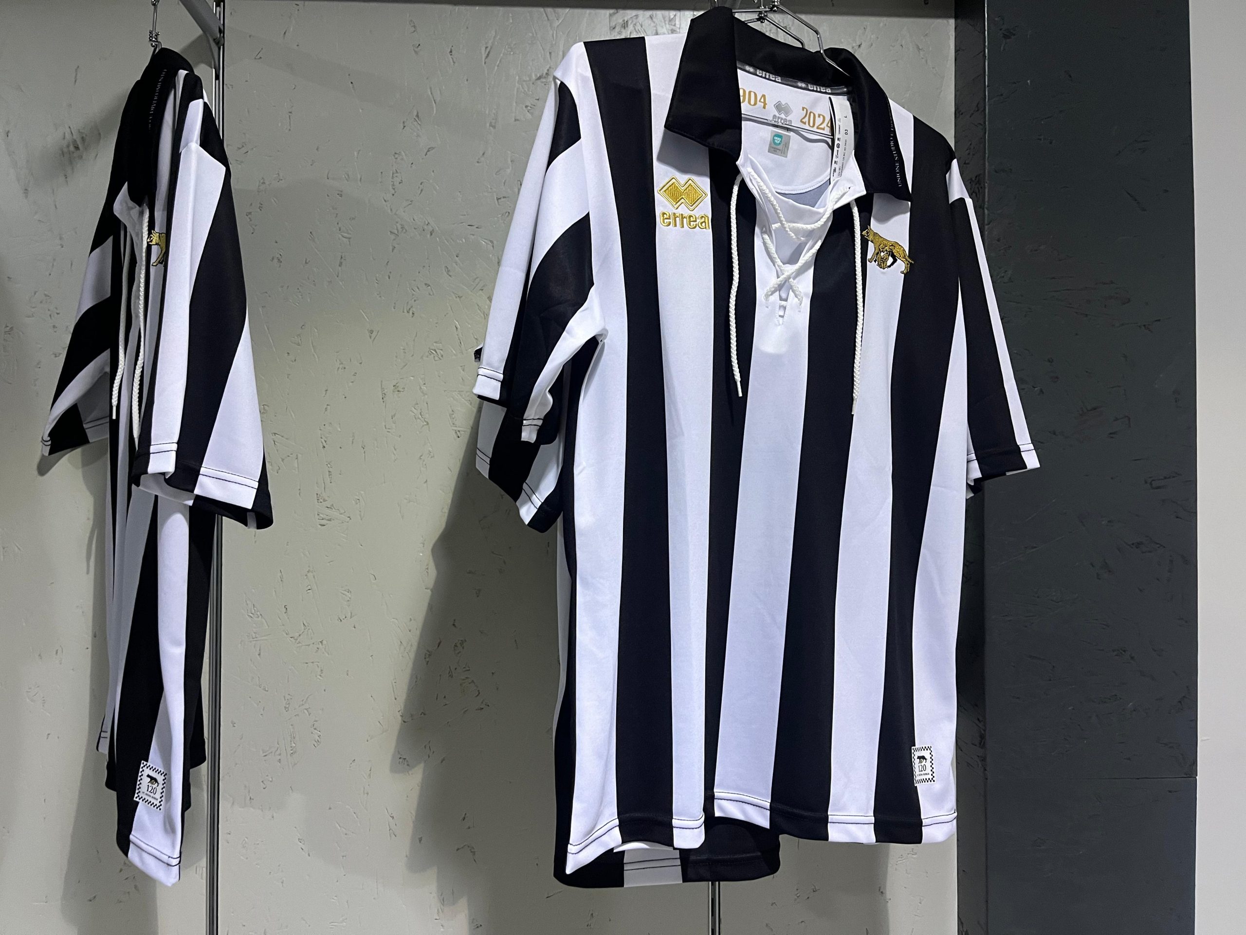 della città, conferiscono un’eleganza esclusiva. Sul retrocollo campeggia il numero “120”, a celebrare l’importante ricorrenza, mentre un’etichetta quadrata posta in basso a sinistra, decorata con la Lupa racchiusa in uno schema a scacchi bianconero, sottolinea l’identità del club.