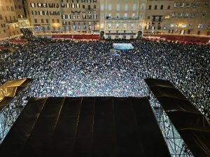 Siena si è svegliata in questo primo giorno del 2026 con ancora negli occhi le luci, i colori e le emozioni di una notte che resterà impressa nella memoria della città. Oltre trentamila persone hanno invaso Piazza del Campo e le vie del centro per salutare il nuovo anno, trasformando la Conchiglia in un grande abbraccio collettivo, fatto di musica, sorrisi e tanta voglia di stare insieme. Il colpo d’occhio è stato impressionante: la Piazza più bella del mondo gremita fino all’ultimo gradino, bar e ristoranti pieni già dal tardo pomeriggio, tutte le strade affollate da famiglie, giovani, giovanissimi e visitatori arrivati anche da fuori Italia. L’atmosfera elettrica, ma sempre ordinata e serena, segno di una comunità che sa divertirsi nel rispetto di tutti.