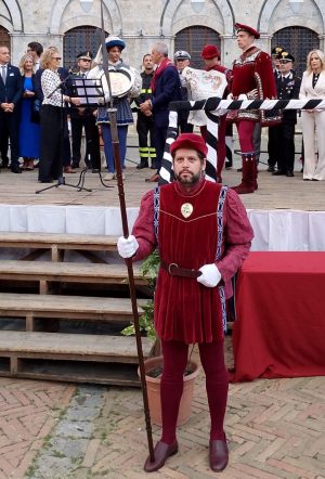 “Perdonerete l’emozione – ha detto il Sindaco di Siena Nicoletta Fabio – ma tutte le volte che sento il suono dei tamburi o vedo sventolare le bandiere, tutte le volte che un popolo entra in Piazza del Campo cantando, io mi sento senese, e mi sento felice. Questo pomeriggio si consegnano dei riconoscimenti ad alcuni dei protagonisti dei Palii di quest’anno: la comparsa che più si è distinta, la miglior coppia di alfieri e i proprietari dei cavalli vincitori. Questa cerimonia è però anche un momento di riconoscimento nei confronti degli economati delle Contrade, che sono composti da persone deputate alla custodia non soltanto dei nostri oggetti più cari, ma anche della nostra storia, della nostra cultura e dei nostri sentimenti più profondi. Non a caso, quando alle Contrade è stato chiesto di scegliere quali fossero gli oggetti materiali più simbolici per chiedere al Ministero della Cultura il riconoscimento del Palio come identità collettiva, le Contrade hanno scelto bandiere e tamburi”.