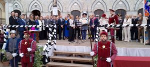 E’ stato il suono dei Trombetti di Palazzo a salutare l’inizio della cerimonia, iniziata con la consegna, da parte del Sindaco di Siena Nicoletta Fabio, delle pergamene e dei “bandierini” ai proprietari dei cavalli vincitori del Palio del 4 luglio e del Palio del 17 agosto, in particolare Riccardo Coppini e Antonio Siri, proprietari di Tabacco, castrone sauro di dodici anni, che ha vinto il Palio del 4 luglio per la Contrada dell’Onda alla sua settima esperienza in piazza del Campo (diventate otto con il Palio di agosto); Dario Colagé, proprietario di Benitos, castrone sauro di sette anni, che ha vinto il Palio del 17 agosto per la Contrada della Lupa e alla sua prima esperienza in piazza del Campo. A realizzare i “bandierini” sono stati gli allievi del Liceo artistico di Siena “Duccio di Boninsegna”: Anna Mugnaini ha realizzato il bandierino per il cavallo vincitore del Palio del 4 luglio; Anna Perrino ha realizzato il bandierino per il cavallo vincitore del Palio del 17 agosto; Elsa Tamburini ha realizzato la pergamena per il cavallo vincitore del Palio del 4 luglio; Marta Marini ha realizzato la pergamena per il cavallo vincitore del Palio del 17 agosto. Gli studenti hanno eseguito i lavori sotto la direzione dei professori Giovanni Pala e Alice Leonini.