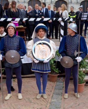 E’ stato consegnato ufficialmente oggi pomeriggio alla Contrada della Torre il Masgalano 2024, durante la cerimonia che si è tenuta in piazza del Campo a Siena, alla presenza dei paggi delle diciassette Contrade, delle autorità cittadine e dei Priori delle diciassette Contrade. La cerimonia si è tenuta oggi a seguito del rinvio di sette giorni per la scomparsa dell’ex Capitana della Torre Maria Aurora Misciattelli, lutto che ha colpito la Contrada e tutta la città. Il Masgalano, offerto quest’anno dal Gruppo Donatori di Sangue delle Contrade, è il premio assegnato alla Contrada la cui comparsa risulta essere la migliore per eleganza, dignità di portamento e coordinazione nel corso del Corteo Storico.