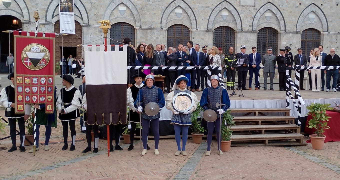 “Perdonerete l’emozione – ha detto il Sindaco di Siena Nicoletta Fabio – ma tutte le volte che sento il suono dei tamburi o vedo sventolare le bandiere, tutte le volte che un popolo entra in Piazza del Campo cantando, io mi sento senese, e mi sento felice. Questo pomeriggio si consegnano dei riconoscimenti ad alcuni dei protagonisti dei Palii di quest’anno: la comparsa che più si è distinta, la miglior coppia di alfieri e i proprietari dei cavalli vincitori. Questa cerimonia è però anche un momento di riconoscimento nei confronti degli economati delle Contrade, che sono composti da persone deputate alla custodia non soltanto dei nostri oggetti più cari, ma anche della nostra storia, della nostra cultura e dei nostri sentimenti più profondi. Non a caso, quando alle Contrade è stato chiesto di scegliere quali fossero gli oggetti materiali più simbolici per chiedere al Ministero della Cultura il riconoscimento del Palio come identità collettiva, le Contrade hanno scelto bandiere e tamburi”.