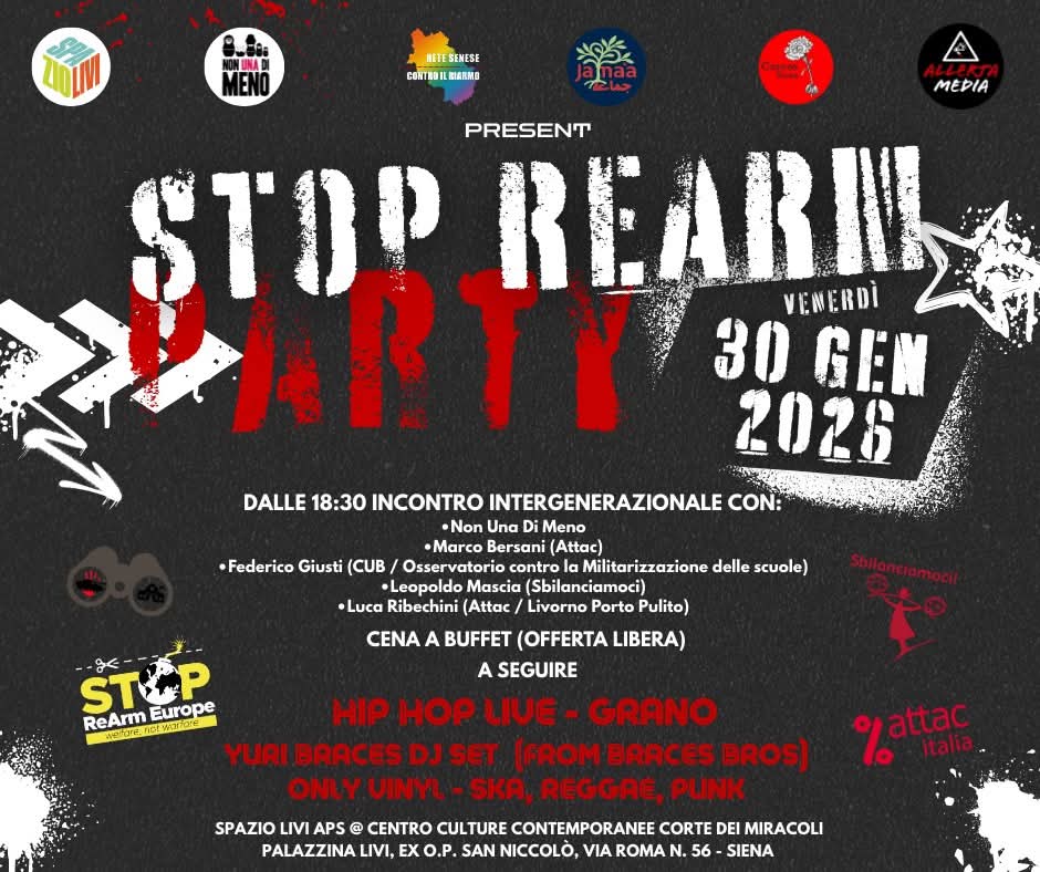 Un pomeriggio e una serata di confronto, musica e socialità per dire no alla corsa al riarmo e alla militarizzazione della società. È questo lo spirito dello “Stop Rearm Party”, l’iniziativa in programma domani, venerdì 30 gennaio, allo Spazio Livi APS presso il Centro Culture Contemporanee Corte dei Miracoli, nella Palazzina Livi dell’ex ospedale psichiatrico San Niccolò, in via Roma 56 a Siena.