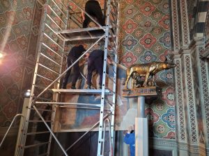 “Torniamo da oggi – spiega l’assessore alla cultura del Comune di Siena Pasquale Colella Albino – ad ammirare questa opera nella sua collocazione all’interno del vestibolo che ne permette l’adeguata conservazione. Ritroviamo, di fatto, la Madonna della Loggia, opera che voleva quindi assumere un profondo significato civico e politico, ravvisabile nei suoi messaggi scritti, nel disco globo sorretto dalla Vergine, nella regalità di questa, e nell’atto benedicente di Gesù Bambino”.