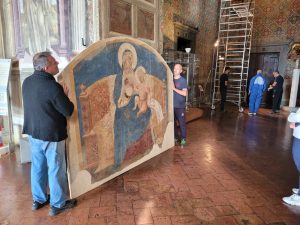 Il Comune di Siena ha provveduto oggi alla ricollocazione nella stanza del vestibolo del Museo Civico dell’opera della Madonna col Bambino di Ambrogio Lorenzetti, meglio nota come Madonna con Bambino (Maestà Madonna della Loggia del Palazzo Comunale), frammento di affresco distaccato, 1340.