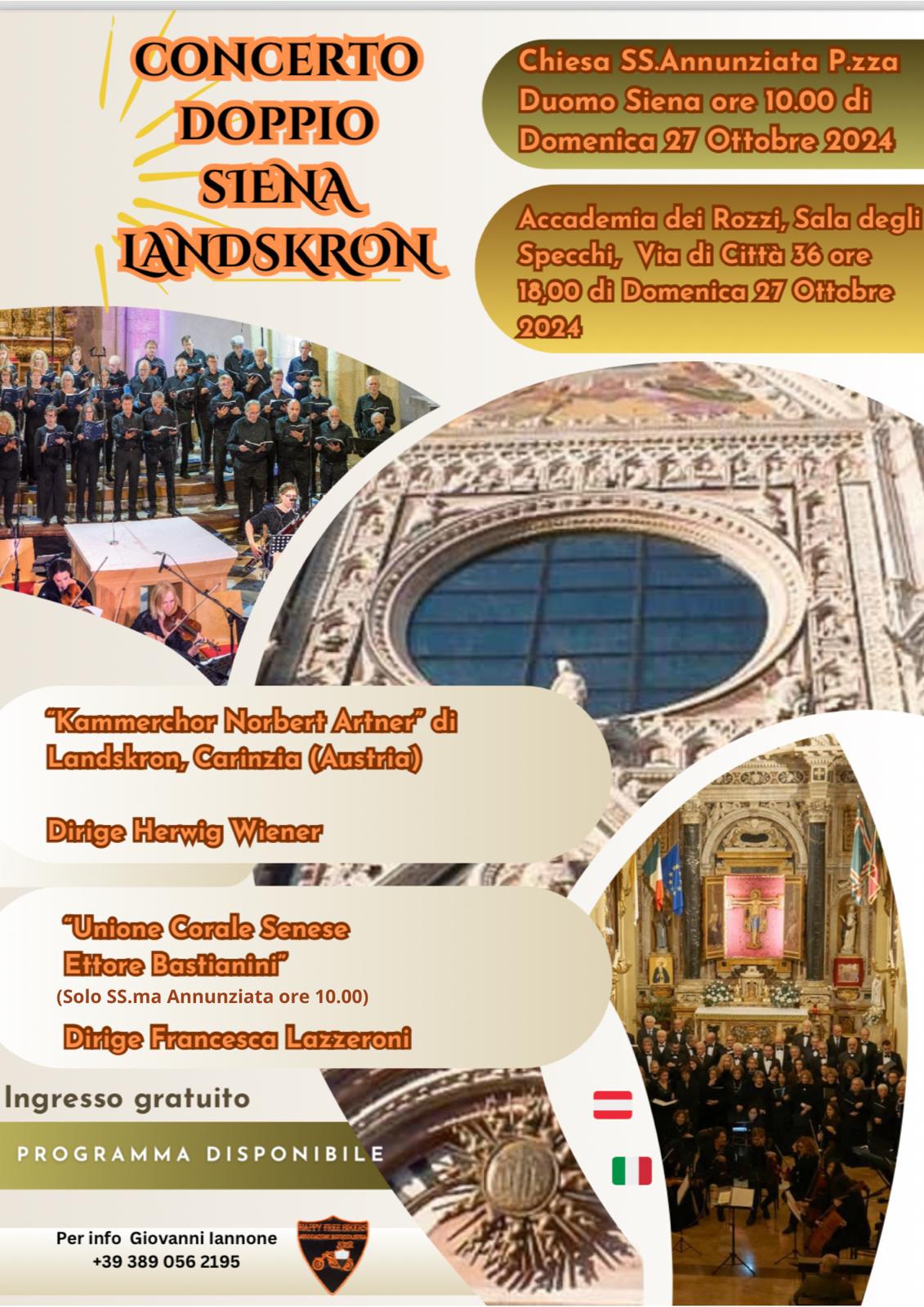 La musica unisce la nostra città a quella austriaca di Landskron grazie al concerto di domenica 27 ottobre, alle ore 10 del mattino, nella chiesa della Santissima Annunziata in Piazza del Duomo a Siena. Si esibirà infatti il coro austriaco “Kammerchor Norbert Artner” di Landskron (Carinzia), in questi giorni nella nostra città, e diretto da Hervig Wiener, insieme all’”Unione Corale Senese Ettore Bastianini”, per la direzione di Francesca Lazzeroni, quale coro ospitante. Anche questa volta dunque la Corale accoglie con entusiasmo i cori ospiti che vengono ad esibirsi nella nostra città nei luoghi più belli di interesse storico artistico e culturale, aperta alla condivisione e alla sperimentazione anche di repertori che le sono meno usuali.