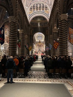 Duomo di Siena gremito per la santa messa di Sant’Ansano, che celebra il Santo Patrono della città e della Chiesa di Siena, e rappresenta l’inizio dell’anno contradaiolo (sarà trasmessa in differita su Siena Tv alle ore 22.30).