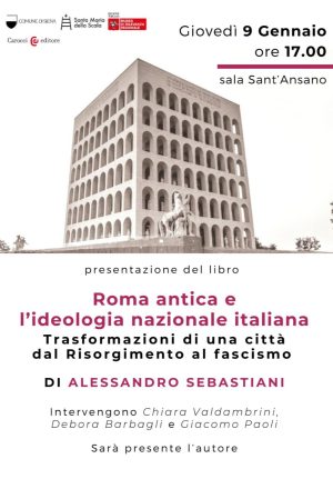Giovedì 9 gennaio 2025, alle ore 17.00 nella sala Sant’Ansano, per il ciclo “IncontriallaScala”, si svolgerà la presentazione del libro “Roma antica e l’ideologia nazionale italiana. Trasformazioni di una città dal Risorgimento al fascismo” di Alessandro Sebastiani.
