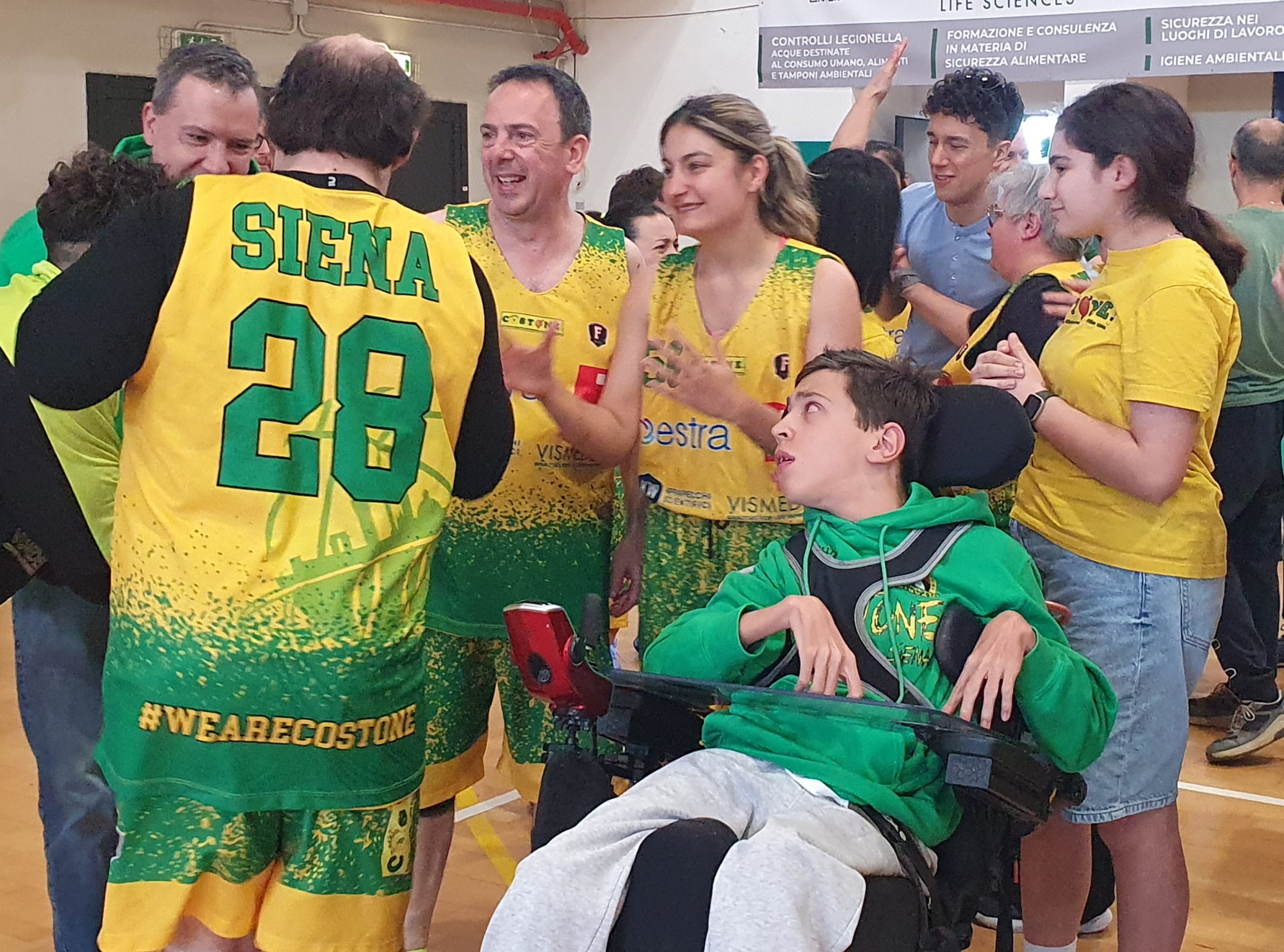 Finisce nel modo più dolce e a tratti clamoroso, considerando le incertezze di partecipazione di metà dicembre, la grande cavalcata dei ragazzi dell’Estra Costone Baskin Siena che sul parquet di casa conquistano la vittoria del Campionato Regionale dopo un percorso tra girone e playoff fatto di sole vittorie. I gialloverdi partono subito con l’acceleratore premuto, sospinti anche dal numeroso pubblico che li ha incitati per tutta la partita, chiudendo il 1° quarto sul 28-18 guidati da un dominante Roberto Chiacig (23) e da un infallibile Giovanni Abbate che dall’area protetta ha realizzato un bottino personale di 24 punti. Nel 2° quarto però il meccanismo si inceppa e Pistoia inizia la rimonta che la porterà a cucire lo strappo fino al -2. I ragazzi di casa, ruoli 3 e 4, fanno fatica a vedere il canestro, ma compensano con una difesa asfissiante e impenetrabile, e con enorme spirito di sacrifico rendono i propri canestri dei veri bunker, ben guidati dai ruoli 5. Il primo tempo finisce sul 44 a 39 per i senesi.