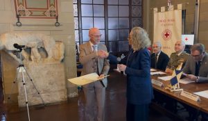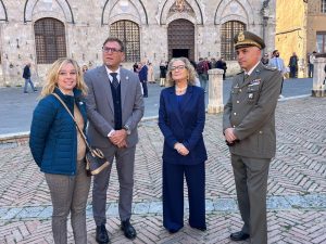 La cerimonia è proseguita in Palazzo Comunale, dove il sindaco Nicoletta Fabio, autorità civili e militari, la Croce Rossa e la Soprintendenza hanno dato il via al convegno dedicato alla salvaguardia dei beni culturali nei contesti di rischio. L’iniziativa è nata dalla collaborazione tra la Croce Rossa, il Comune di Siena e la Soprintendenza Archeologia, Belle Arti e Paesaggio per le province di Siena, Grosseto e Arezzo, e si concretizzerà nelle prossime settimane con l’apposizione dello Scudo Blu sulle mura esterne di porta Camollia, porta Ovile, porta Romana e porta San Marco. Quest’ultima porta ospita anche una targa commemorativa dedicata al generale Joseph Goislard de Monsabert, comandante francese che nel 1944 impedì la distruzione della città.