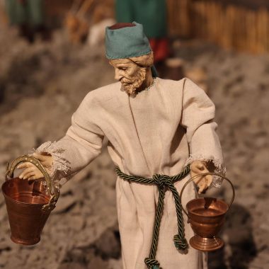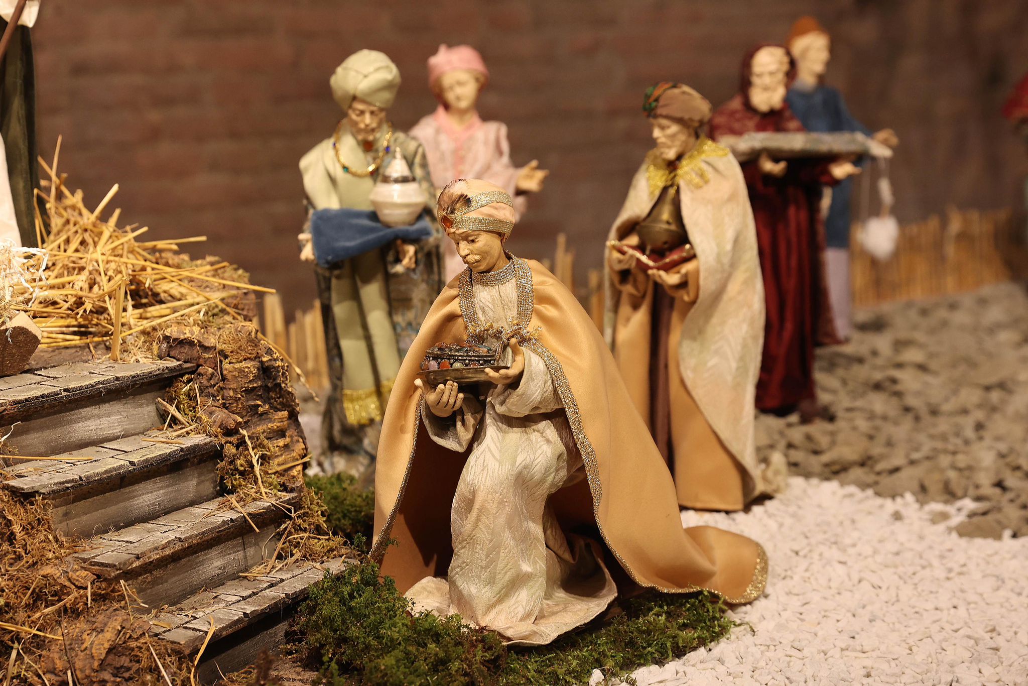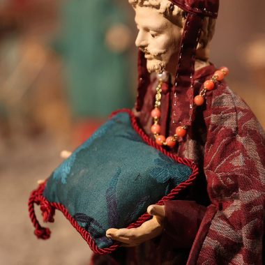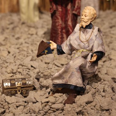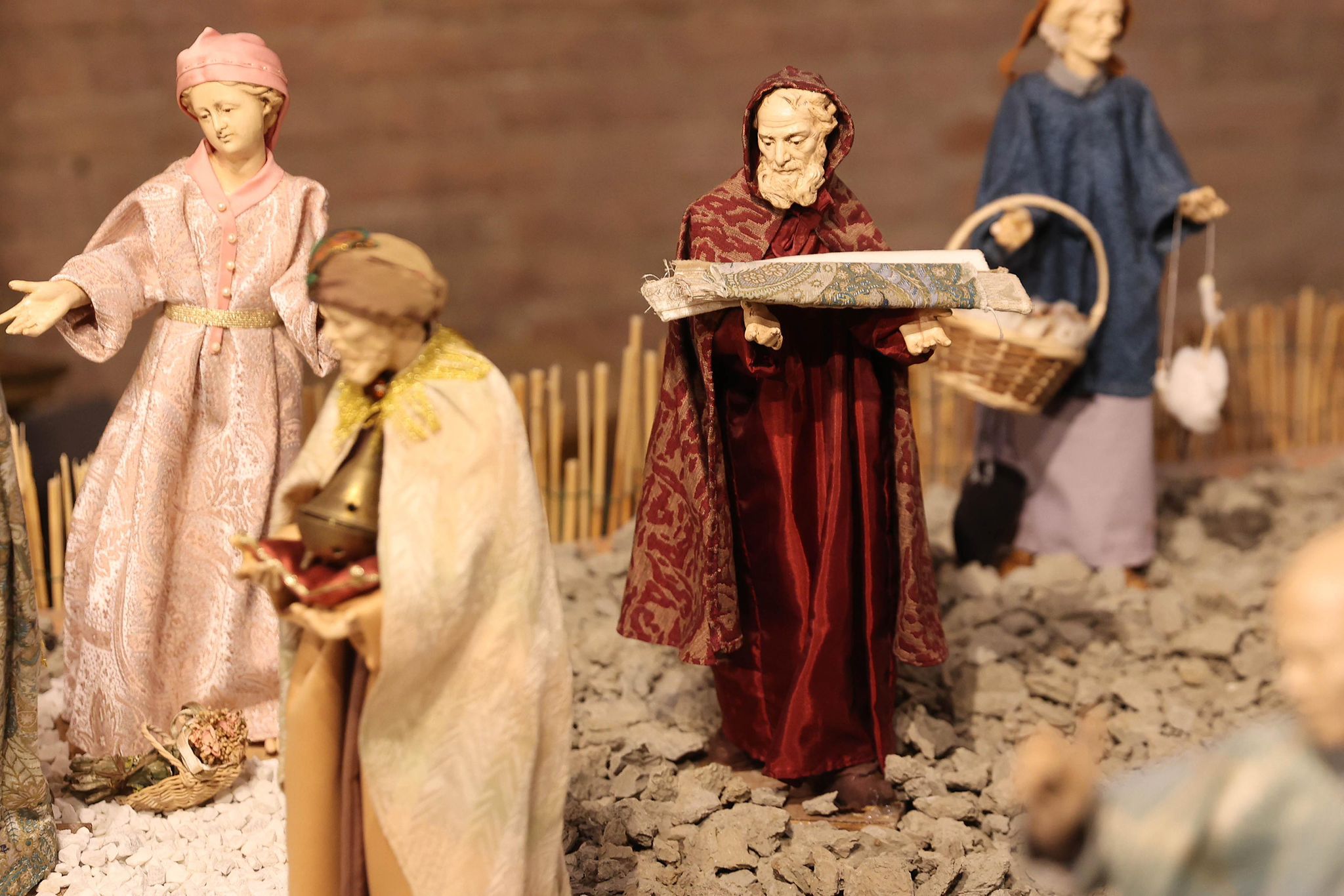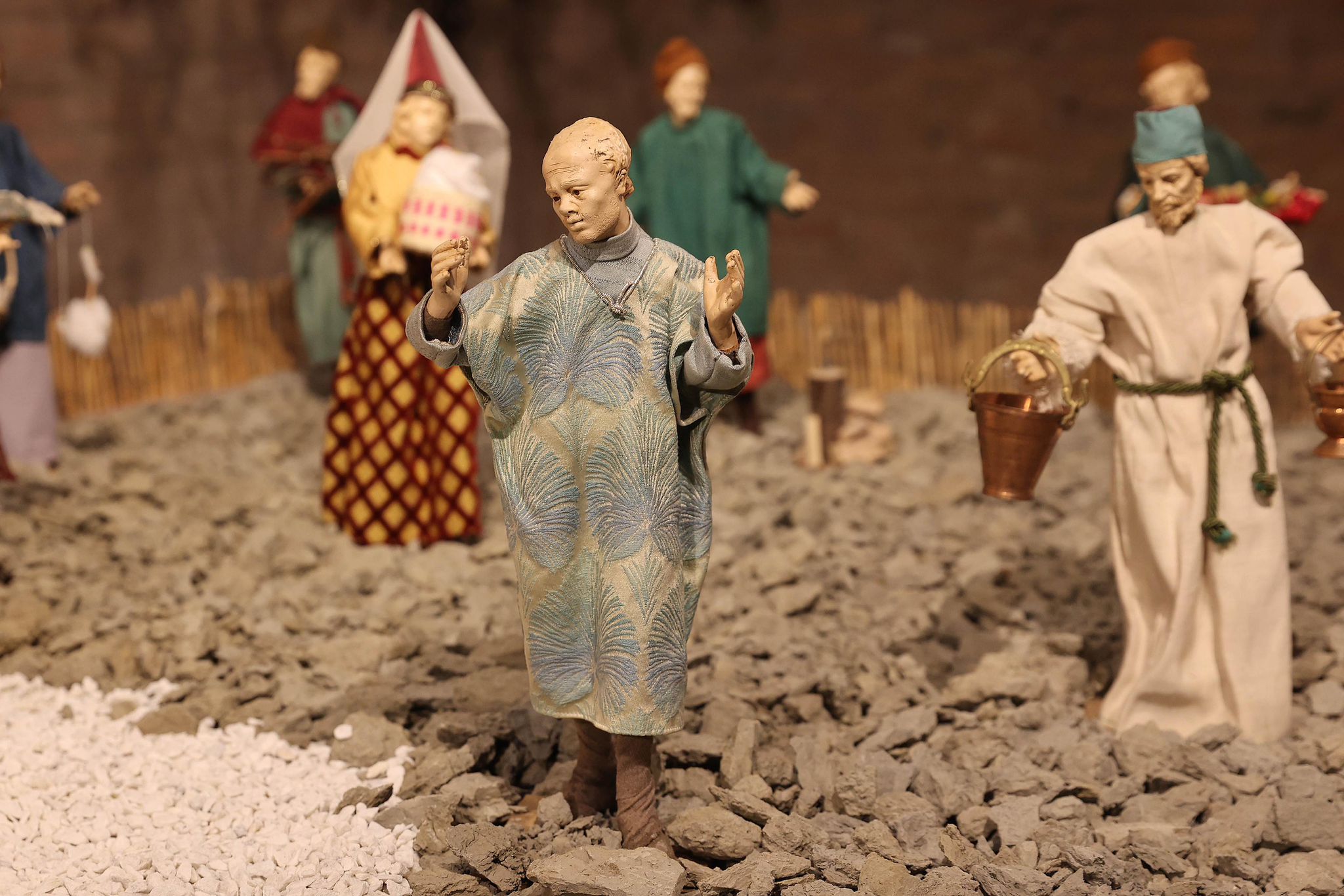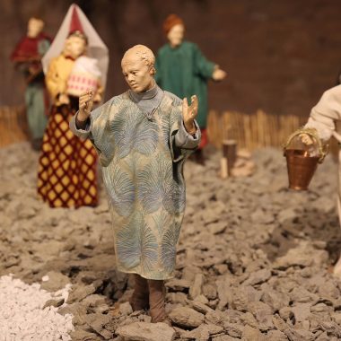 “Mi sono ispirato agli antichi profeti – spiega Padre Alfredo – come Mosè, Isaia, i patriarchi come Abramo, che dovevano salire sempre in alto, sul monte, per incontrare Dio. Con la nascita di Gesù invece non c’è più bisogno di scalare le montagne, perchè è lui che scende dal cielo tra di noi. Pertanto la scelta della terra per rappresentare quello che avevo in mente di fare è caduta su delle zolle di crete senesi, perchè ho pensato che con il loro colore ‘azzurrino’ potessero evidenziare meglio il significato profondo del presepe che alla fine è il cielo che scende sulla terra. Questo è il messaggio che manda quest’anno il presepe di San Domenico. C’è da evidenziare poi la bellezza delle statuine, i cui vestiti sono stati tutti cuciti a mano dalle donne della parrocchia, che hanno fatto un lavoro certosino di ricerca sui costumi e la scelta delle stoffe.