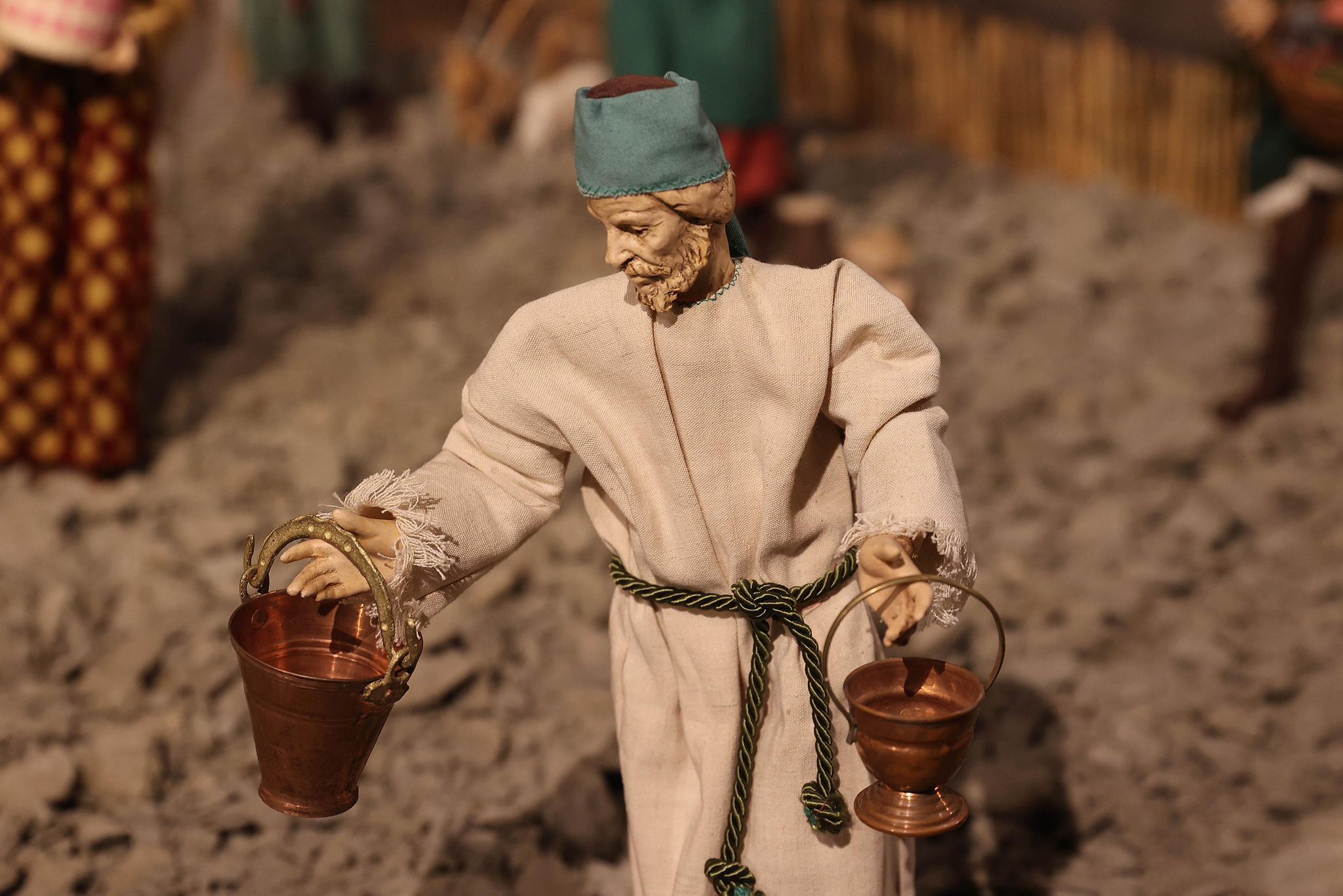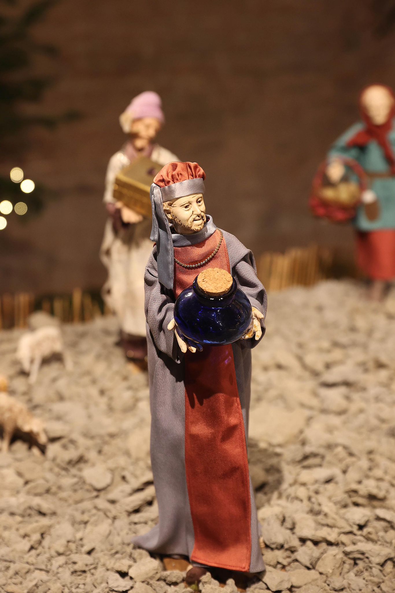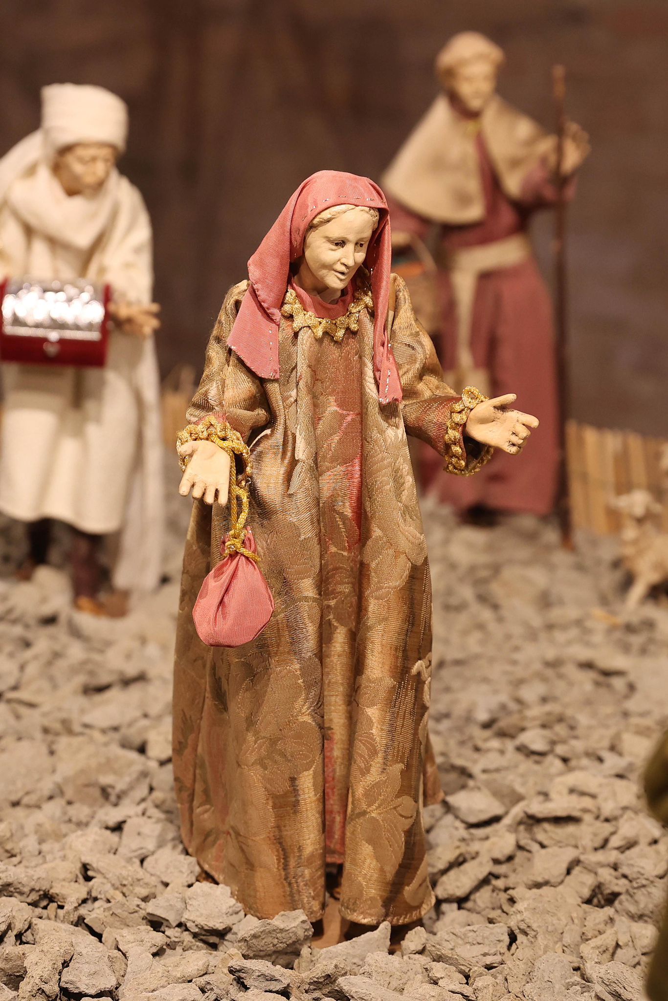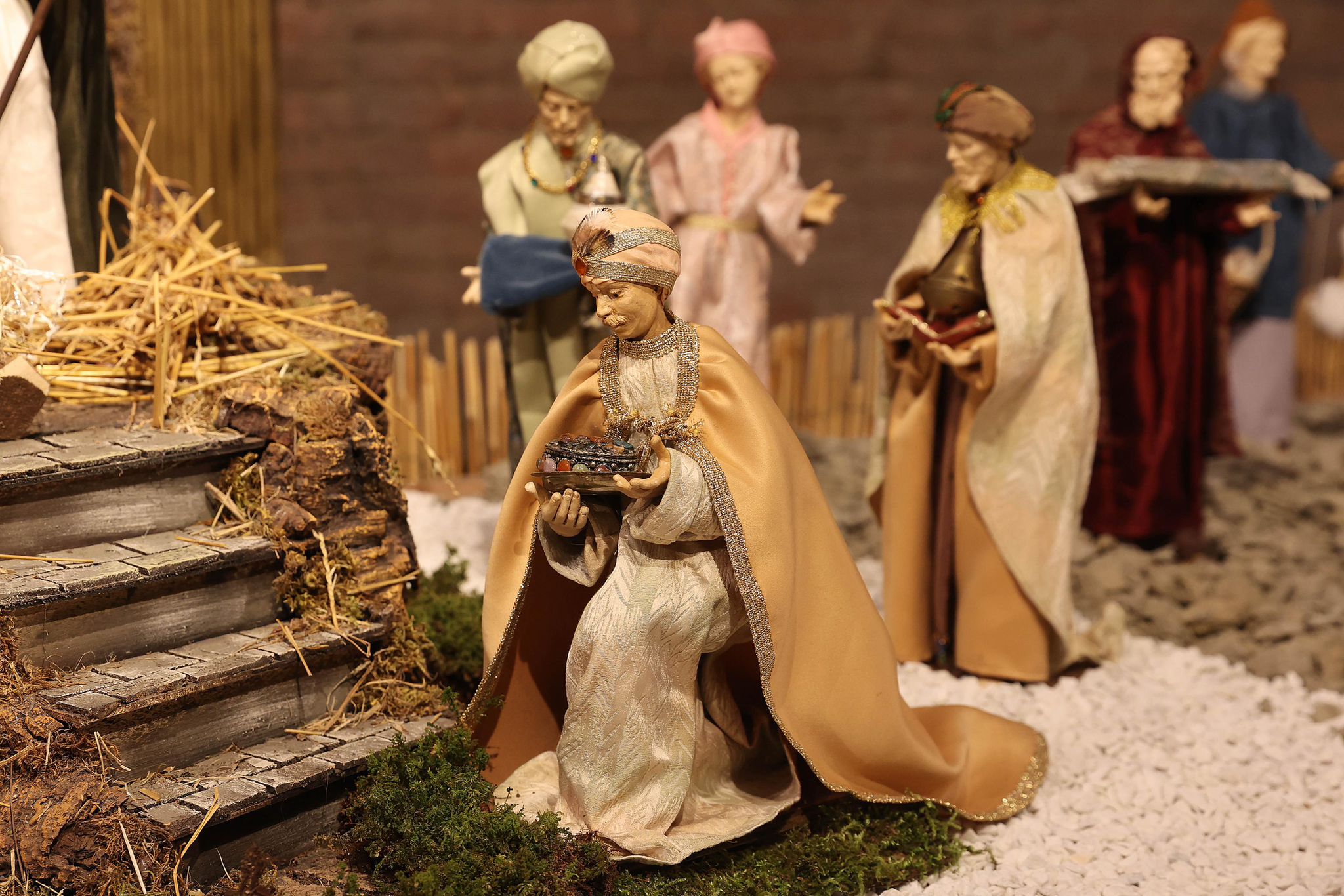 “Mi sono ispirato agli antichi profeti – spiega Padre Alfredo – come Mosè, Isaia, i patriarchi come Abramo, che dovevano salire sempre in alto, sul monte, per incontrare Dio. Con la nascita di Gesù invece non c’è più bisogno di scalare le montagne, perchè è lui che scende dal cielo tra di noi. Pertanto la scelta della terra per rappresentare quello che avevo in mente di fare è caduta su delle zolle di crete senesi, perchè ho pensato che con il loro colore ‘azzurrino’ potessero evidenziare meglio il significato profondo del presepe che alla fine è il cielo che scende sulla terra. Questo è il messaggio che manda quest’anno il presepe di San Domenico. C’è da evidenziare poi la bellezza delle statuine, i cui vestiti sono stati tutti cuciti a mano dalle donne della parrocchia, che hanno fatto un lavoro certosino di ricerca sui costumi e la scelta delle stoffe.