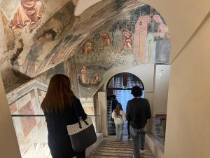 Nei livelli più bassi del complesso, il Museo Archeologico ha offerto un altro tempo ancora: quello delle origini, delle tracce etrusche, romane e medievali, in un dialogo continuo con la materia stessa dell’edificio. E accanto ai percorsi storici, ha raccolto attenzione anche la mostra di Teodora Axente, l’artista scelta per il Palio dell’Assunta 2026. Le sue opere, inserite negli spazi della ex stalla, hanno attirato curiosità e visite, soprattutto da parte di chi ha voluto conoscere da vicino il linguaggio di un’autrice destinata a confrontarsi con uno dei simboli più forti della città.