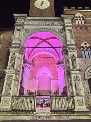 La Cappella di Piazza del Campo e le Logge del Papa illuminate di rosa per celebrare i cento giorni dall’inizio del Giro d’Italia. È quello che è successo a Siena ieri sera, mercoledì 29 gennaio, con lo sguardo proiettato all’arrivo della nona tappa della corsa rosa in città, previsto per domenica 18 maggio.