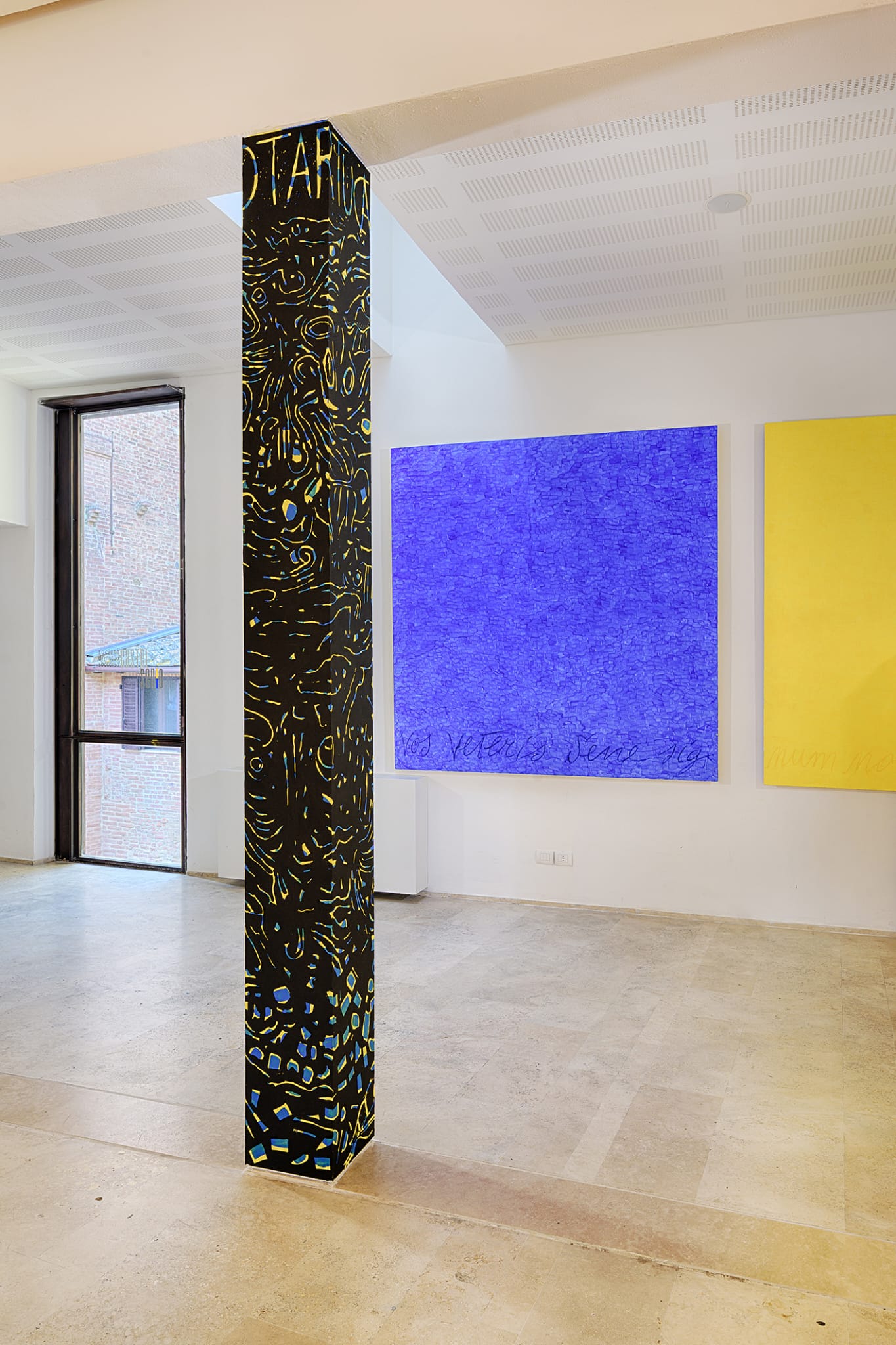 Dentro questo spazio di colore si innesta il pilastro dipinto, che appare come un notturno verticale.