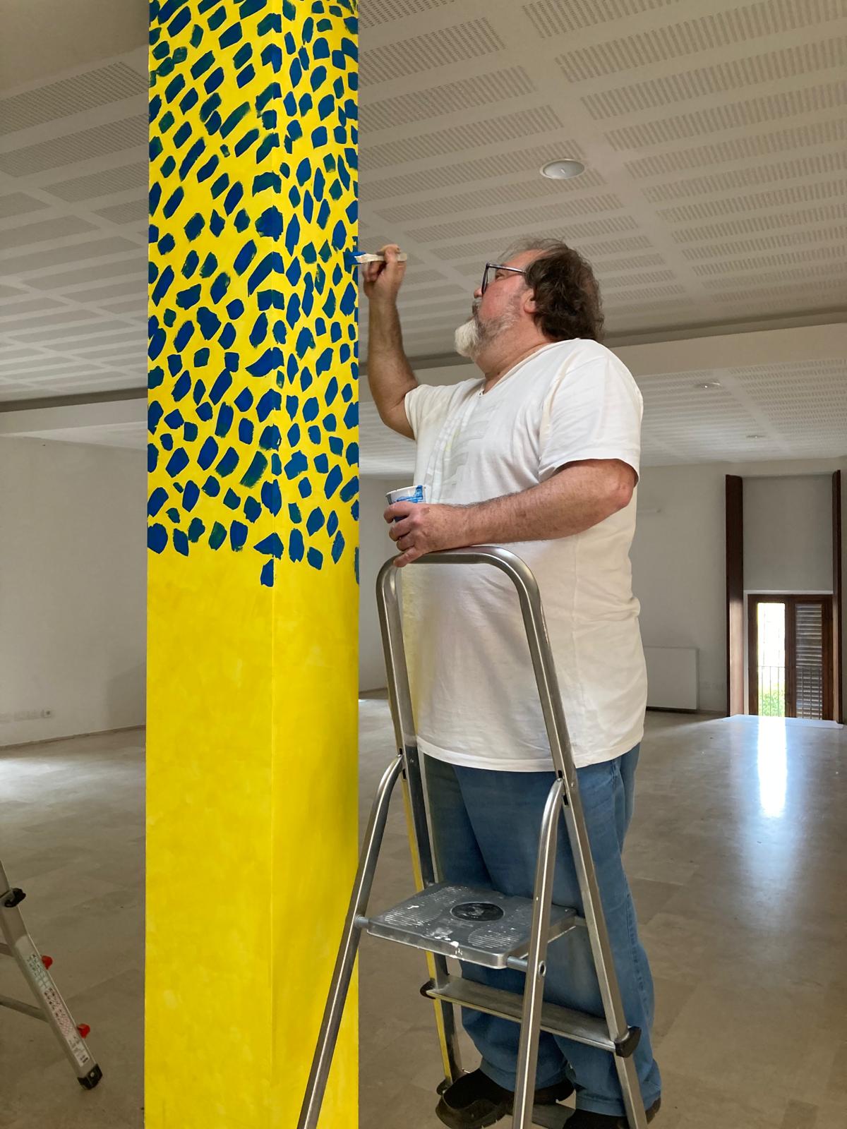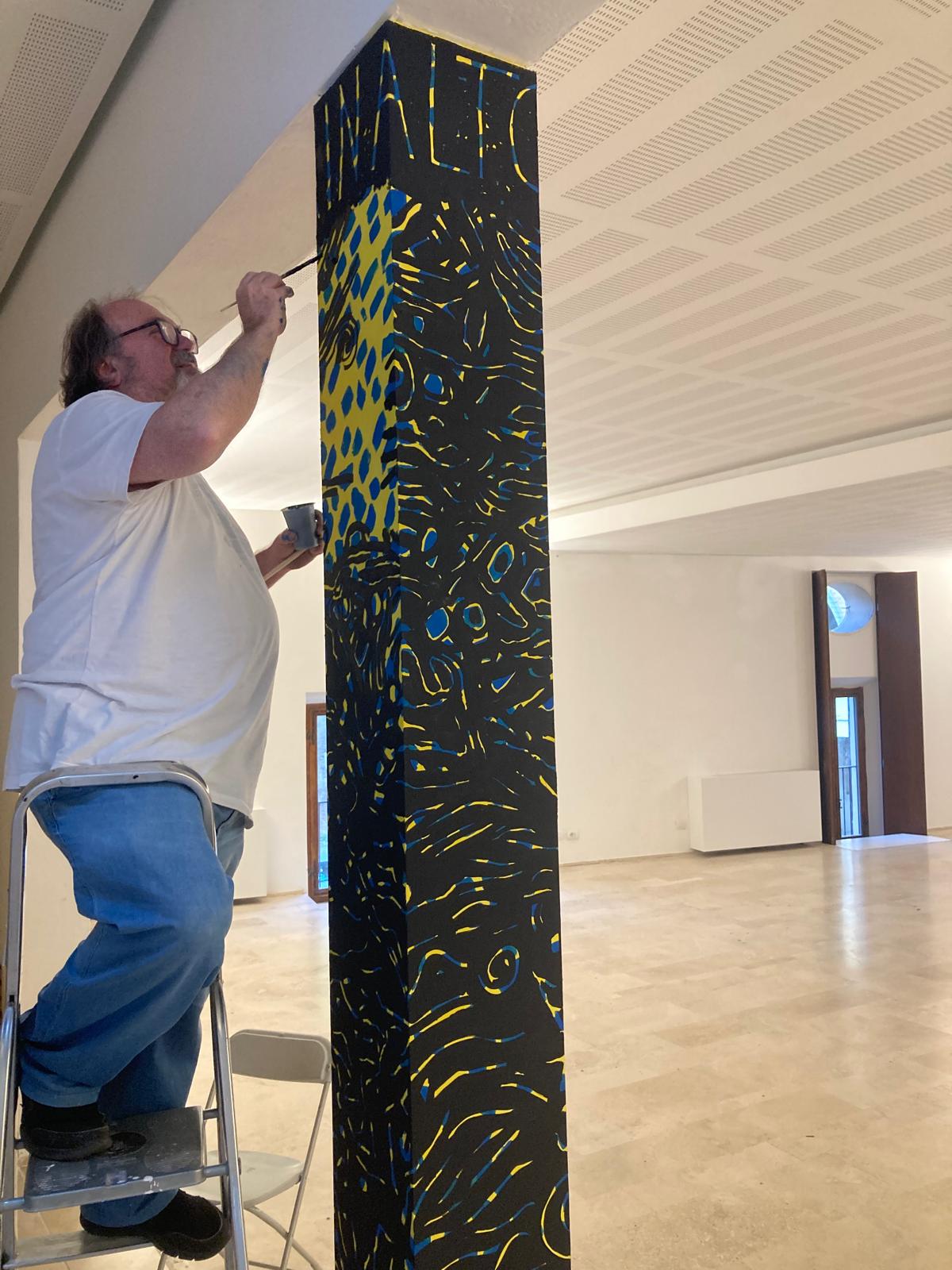 Sul fondo scuro della colonna si accendono segni luminosi: piccole bandiere giallo-blu, strisce di luce, volute, tracce dinamiche, meteore e stelle filanti. Sono segni di festa, quasi frammenti di gioia che attraversano la notte senese. Il linguaggio pittorico di Pizzichini qui si fa leggero e musicale: i segni non descrivono, ma vibrano, come se fossero sospinti dal vento della festa contradaiola. Alla base del pilastro il cielo poggia simbolicamente sul carapace della tartaruga, immagine silenziosa e solida che rimanda al simbolo della Contrada. È come se la Tartuca stessa sostenesse questo cielo festoso. Salendo lungo la colonna, il movimento dei segni diventa sempre più libero, quasi ascensionale, fino a raggiungere la parte alta del pilastro dove, come una scritta luminosa nel cielo della città, appare il celebre motivo dell’inno contradaiolo: “In alto Tartuca…” Qui la pittura diventa voce. Il pilastro non è più soltanto una struttura che regge l’edificio: diventa un canto verticale, una colonna di energia simbolica che collega terra e cielo, memoria e festa, appartenenza e immaginazione. In questo dialogo tra architettura, colore e identità contradaiola, l’intervento di Pizzichini riesce a trasformare un semplice elemento strutturale in un piccolo cosmo festivo, dove la notte di Siena si accende di segni, di luci e di orgoglio tartuchino. E così il pilastro, silenzioso sostegno della sala, diventa improvvisamente qualcosa di più: un frammento di cielo senese che canta.