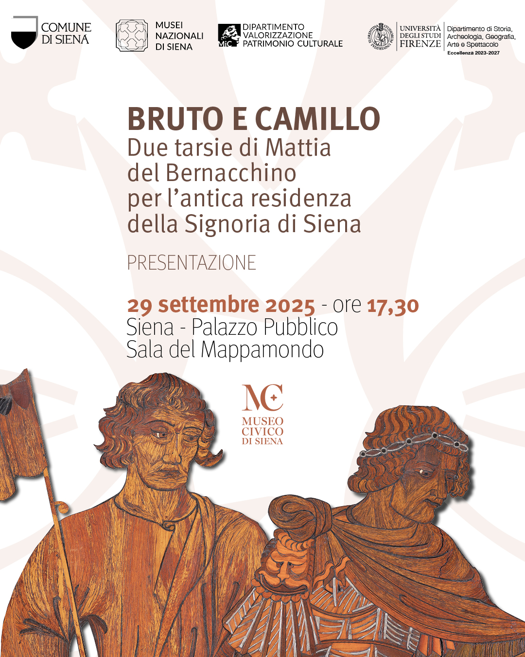 Le tarsie, oggi di proprietà della Pinacoteca Nazionale di Siena, e affidate in deposito al Museo Civico, testimoniano la raffinata arte dell’intarsio senese del Quattrocento e incarnano i valori civici e repubblicani che da sempre trovano espressione nel Palazzo Pubblico. Bruto, fondatore della Repubblica romana, e Camillo, celebrato come secondo fondatore di Roma, tornano così a dialogare con le immagini civiche che ornano la sala, accanto ai capitani di guerra senesi e ai capolavori pittorici che vi si conservano.