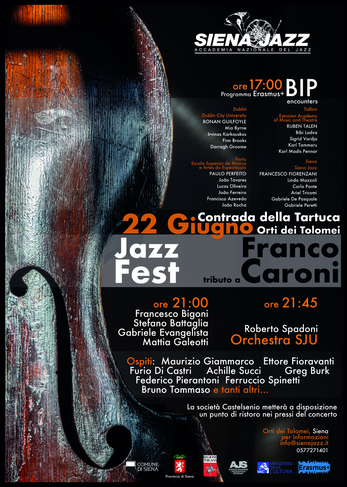 L’evento avrà inizio già nel pomeriggio alle ore 17, con la partecipazione di tre formazioni musicali provenienti da altrettanti Conservatori Europei, in ricordo dei programmi di cooperazione internazionale sempre fortemente promossi da Franco Caroni. Le performance saranno il risultato di un programma didattico intensivo che dal 18 al 22 giugno ospiterà a Siena tre prestigiose accademie musicali europee, ovvero Dublin City University, Estonian Academy of Music and Theatre di Tallinn, Escola Superior de Música e Artes do Espetáculo di Porto, accompagnati dai propri docenti, Ronan Guilfoyle (Dublino), Ruben Talen (Tallinn), Paulo Perfeito (Porto) e Francesco Fiorenzani (Siena). Il progetto, sostenuto attraverso il Ministero Italiano della Cultura, al contributo per il sostegno dei progetti mirati alla promozione della musica jazz, e dal Programma Erasmus+, vede la partecipazione di docenti e studenti dei Conservatori ospiti che in collaborazione con i migliori studenti di Siena Jazz si confronteranno sull’improvvisazione creativa, e sulla costruzione di repertori congiunti.