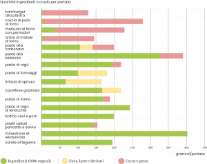 Nelle settimane prese in analisi nel report vengono presentati piatti elaborati come il tortino di lenticchie e verdure, il gulasch di ceci e verdure, il tortino di ceci e porri, lo sformato vegetale di cavolfiore alla salvia, le cotolette di ceci, l’hummus con crostini, lo spezzatino di soia ai funghi, l’insalata di tofu e noci e le polpette di lenticchie.