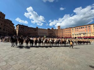 In Piazza del Campo a Siena sono arrivati cavalli e cavalieri dell’Equiraduno del Giubileo 2025, una delle tappe di un lungo viaggio a cavallo che in diciotto giorni, lungo la Via Francigena, porterà cavalieri e amazzoni fino a Roma. Siena fa parte di questo cammino e lo fa con ciò che più la rappresenta: la storia, il legame profondo con il cavallo, la capacità di accogliere e raccontare spiritualità e paesaggio in un’unica immagine.