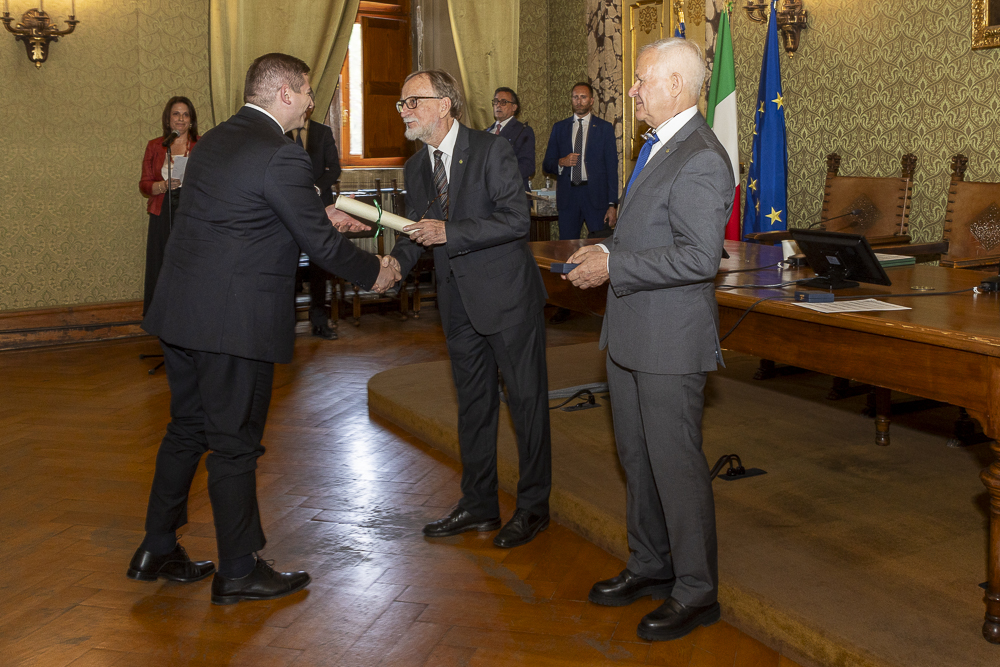 Il Dr. Andreano ha ritirato il Premio accompagnato dal Prof. Rino Rappuoli, Direttore Scientifico di Fondazione Biotecnopolo di Siena, dal Dr. Gianluca Polifrone, Direttore Generale di Fondazione Biotecnopolo di Siena, e alla presenza del Ministro della Salute, Orazio Schillaci.
