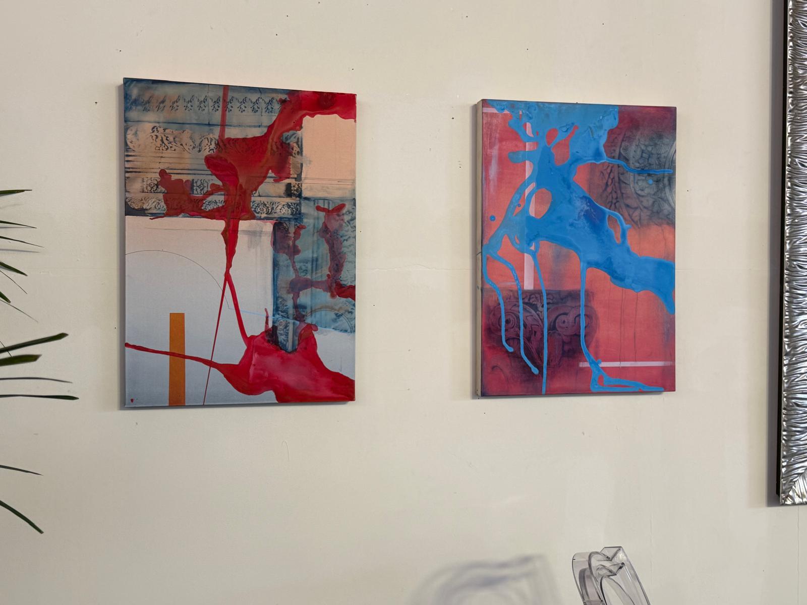 “Sono partito dal figurativo, poi successivamente, studiando, ho cominciato ad andare verso una pittura più astratta, anche se non ho abbandonato mai l’origine. Le tele esposte negli studi di Siena Tv sono una dimostrazione, perché ho unito le due “anime”, figurativa e astratta, che dialogano tra se. Mi sono ispirato ad artisti come Rauschemberg (esponente del neodadaismo e precursore della pop art, ndr) e ad un artista più recente, Pieter Vermeersch, dal quale ho preso gli sfondi lisci e delicati che stanno sulla tela come base. Io poi intervengo usando la ‘cianotipia’, una tecnica fotografica dell’800 che imprime l’immagine, e successivamente faccio questo ‘gocciolamento controllato’ che invade la pittura, in alcuni casi copre la tela, in altri lascia trasparire quello che c’è sotto, come se una parte non potesse fare a meno dell’altra. Perché, anche se sembra un controsenso, l’arte astratta ha delle radici prettamente accademiche e figurative”.