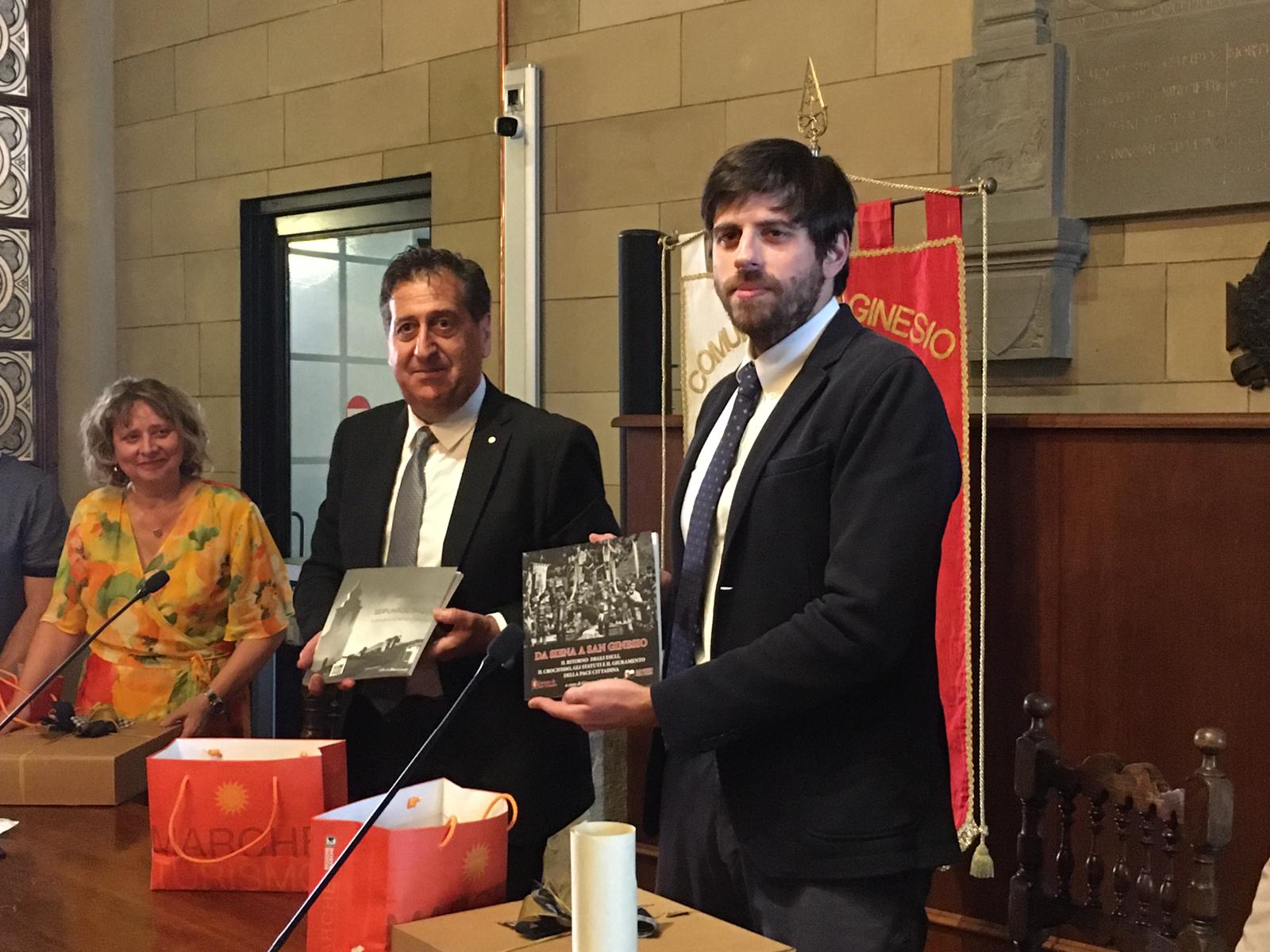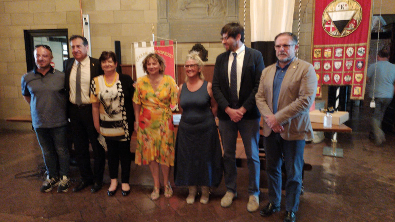 Per l’occasione il vicesindaco ha donato al sindaco Ciabocco una pergamena realizzata gratuitamente da Stefano Pellati con scritto: “Per rinsaldare un’amicizia più forte della calamità che ha caratterizzato questi tempi, le Comunità di Siena e San Ginesio si abbracciano oggi idealmente”.