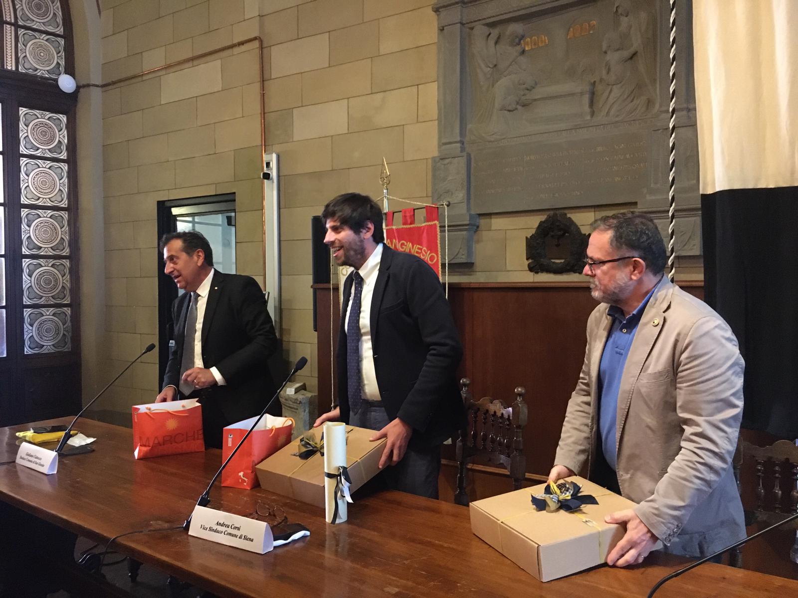 Per l’occasione il vicesindaco ha donato al sindaco Ciabocco una pergamena realizzata gratuitamente da Stefano Pellati con scritto: “Per rinsaldare un’amicizia più forte della calamità che ha caratterizzato questi tempi, le Comunità di Siena e San Ginesio si abbracciano oggi idealmente”.