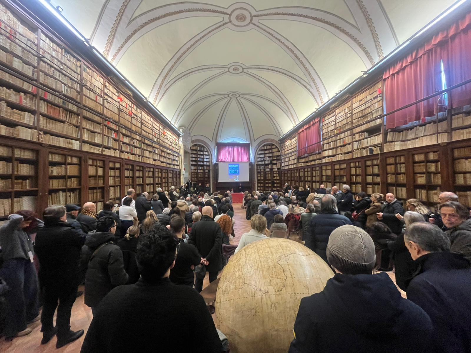 La Sala storica della Biblioteca comunale degli Intronati era già piena quasi un’ora prima dell’inizio. Fuori, una fila rimasta senza posto. Dentro, un sabato mattina insolito per affluenza e attenzione: oltre 200 persone per la presentazione del libro “Lo scandalo Israele” di David Parenzo, appuntamento arrivato dopo una settimana di polemiche e di discussioni anche sul fronte della sicurezza.
