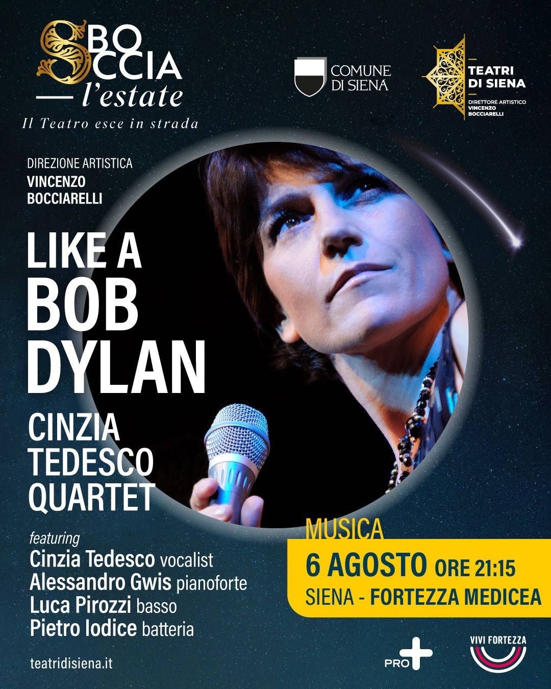 Si comincia mercoledì 6 agosto alle ore 21.15 con la musica di “Like a Bob Dylan”, concerto del Cinzia Tedesco Quartet: Cinzia Tedesco vocalist, Alessandro Gwis al pianoforte, Luca Pirozzi al basso e Pietro Iodice alla batteria. Venerdì 8 agosto alle ore 21.15 sarà la volta di “Gaber…e pensare che c’era il pensiero”, teatro-canzone con Luca Martella e la sua band. Per entrambi gli eventi è possibile acquistare i biglietti su TicketOne.