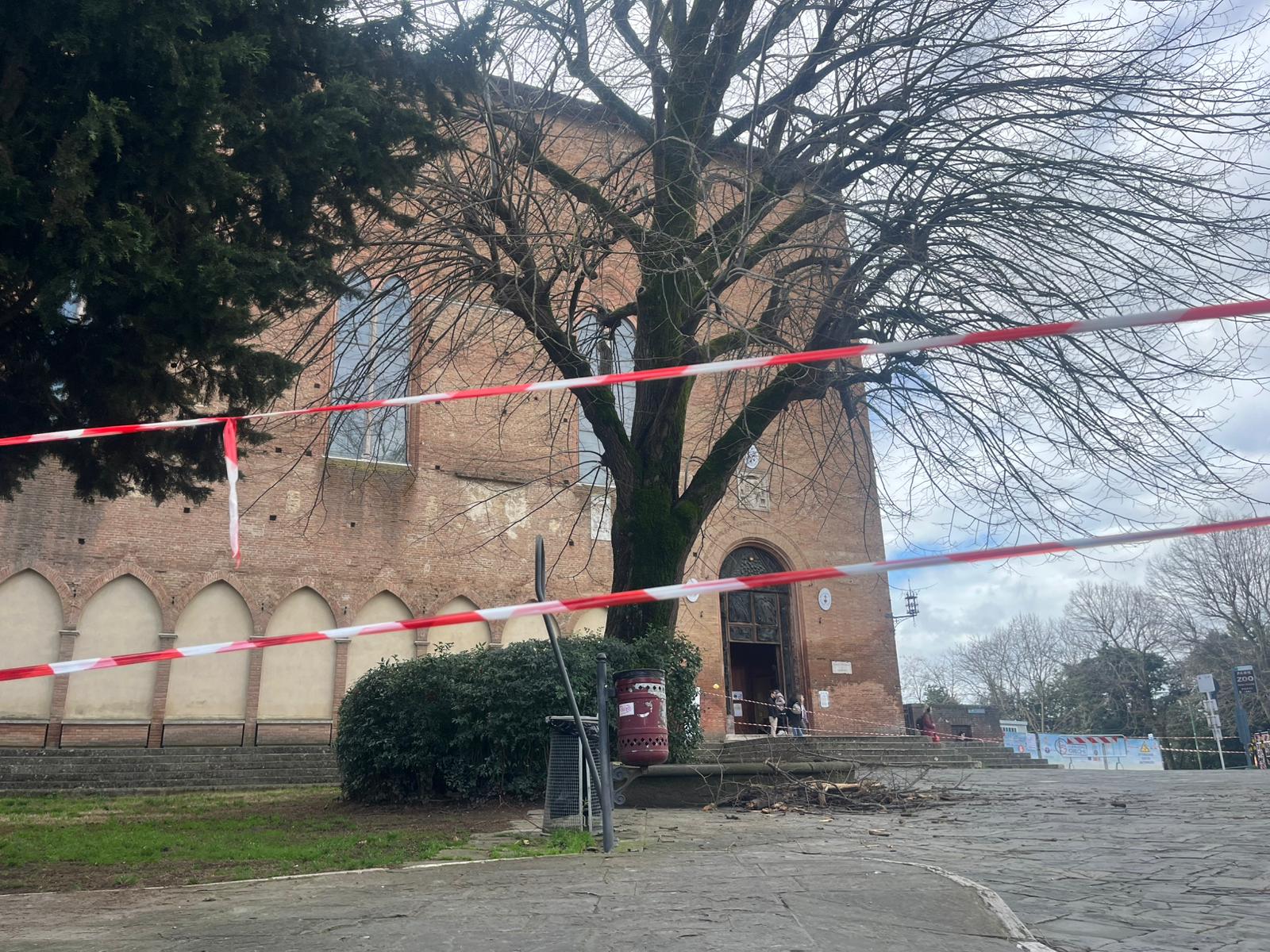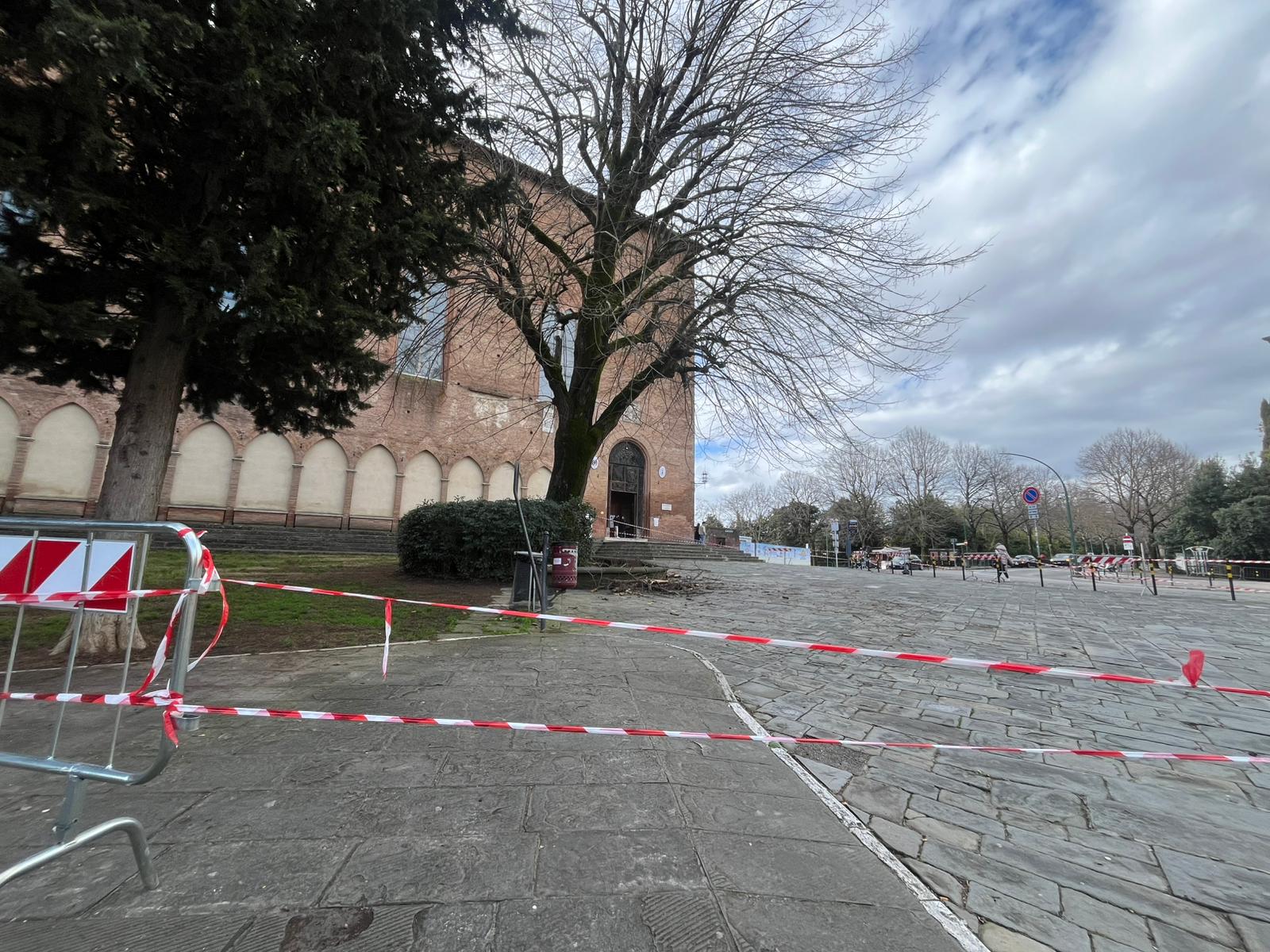 Dopo la caduta di alcuni rami restano le transenne per sicurezza, ma il Comune non ha ancora affidato incarichi ufficiali: è stata svolta una dendrometria e sono attesi i risultati
