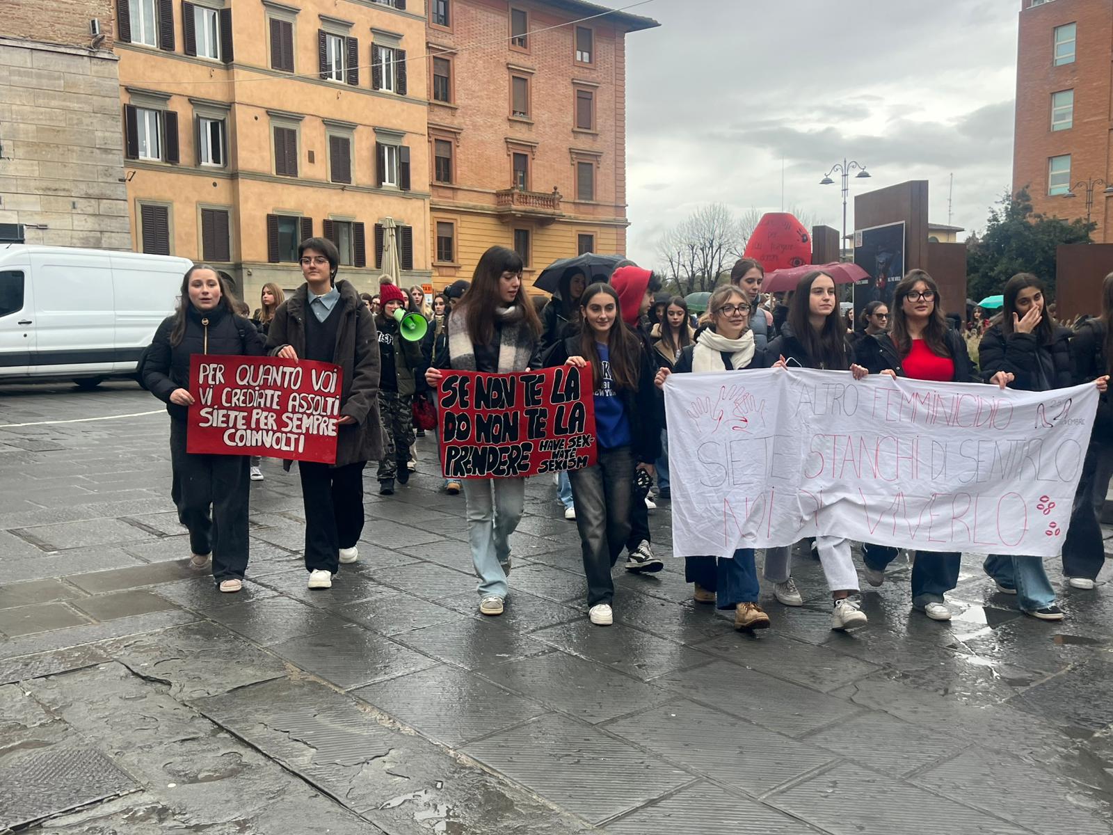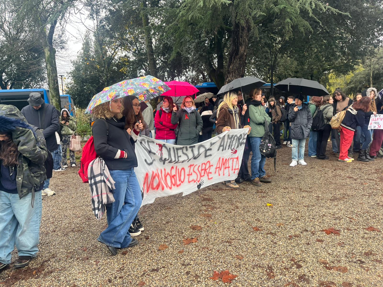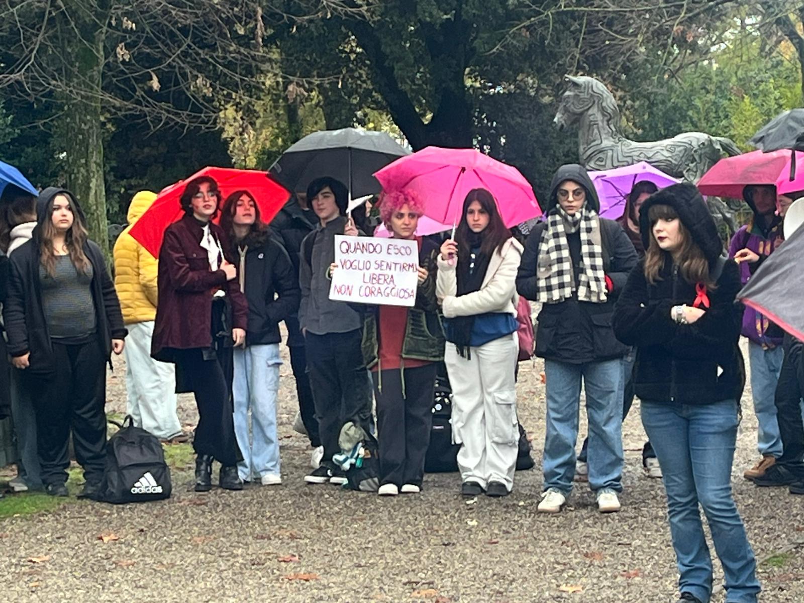 La pioggia non ha fermato il passo di trecento studenti, questa mattina, lungo le vie del centro. Dietro gli ombrelli, spuntavano cartelli, striscioni e soprattutto volti giovani, decisi a non lasciare che la Giornata internazionale contro la violenza sulle donne passasse inosservata.