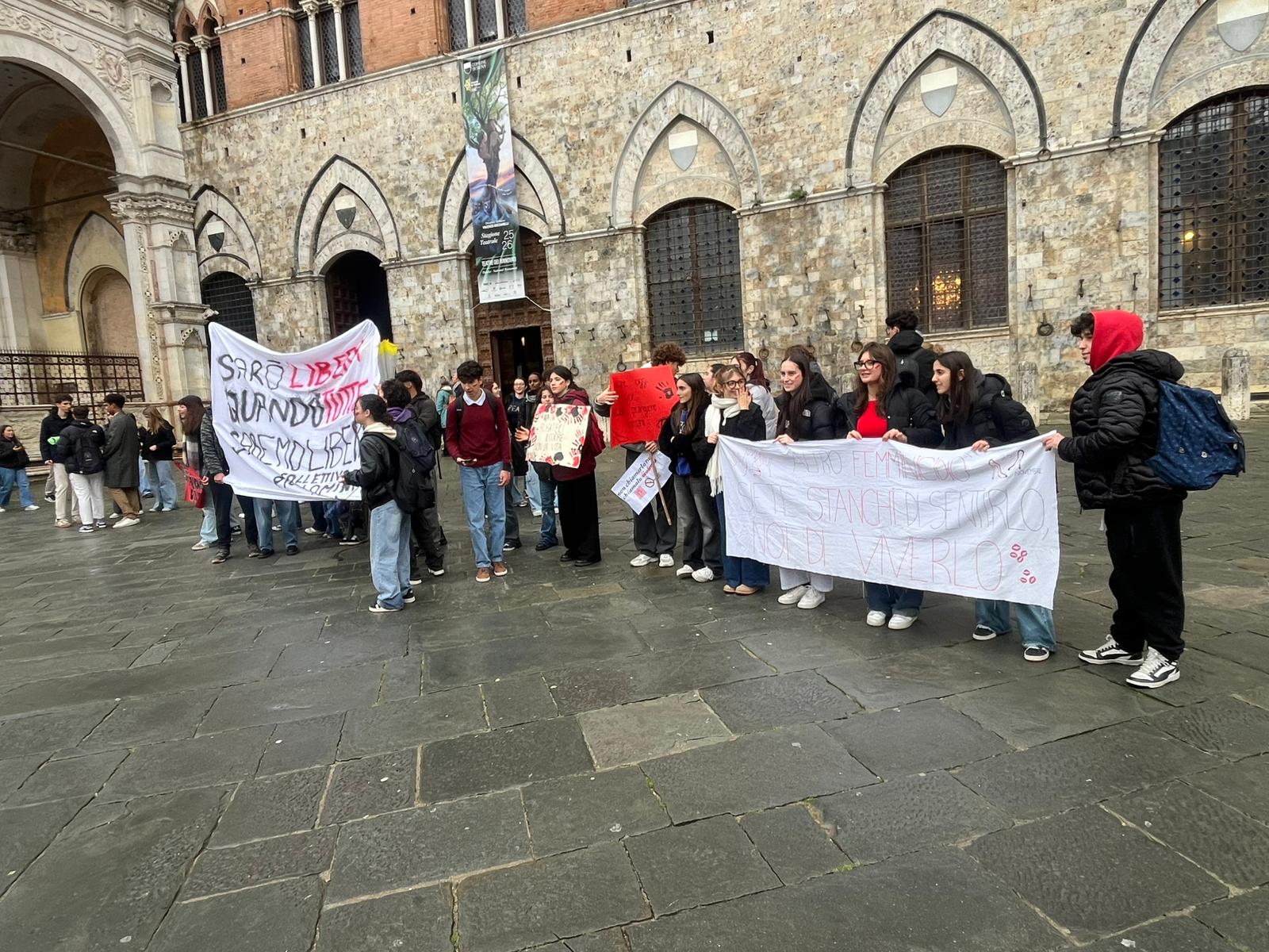 Intanto, dall’Istituto Piccolomini, è partito un corteo ordinato che da Sant’Agostino è arrivato fino a Piazza della Posta. Qui le due scuole si sono unite, formando un unico serpentone, scortato con attenzione da Polizia Locale, carabinieri e Polizia di Stato. “Sarò libera quando tutte saremo libere”, si leggeva sullo striscione portato dal collettivo Piccolomini, sintesi di una volontà che oggi le nuove generazioni sentono nella propria pelle.