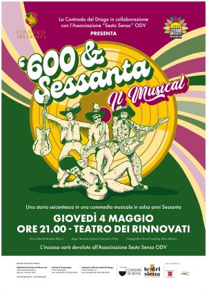 Tutto esaurito al Teatro dei Rinnovati giovedì 4 maggio per il musical “600 &Sessanta”, portato in scena dalla Contrada del Drago insieme all’Associazione Sesto Senso ODV e con il patrocinio del Comune di Siena.