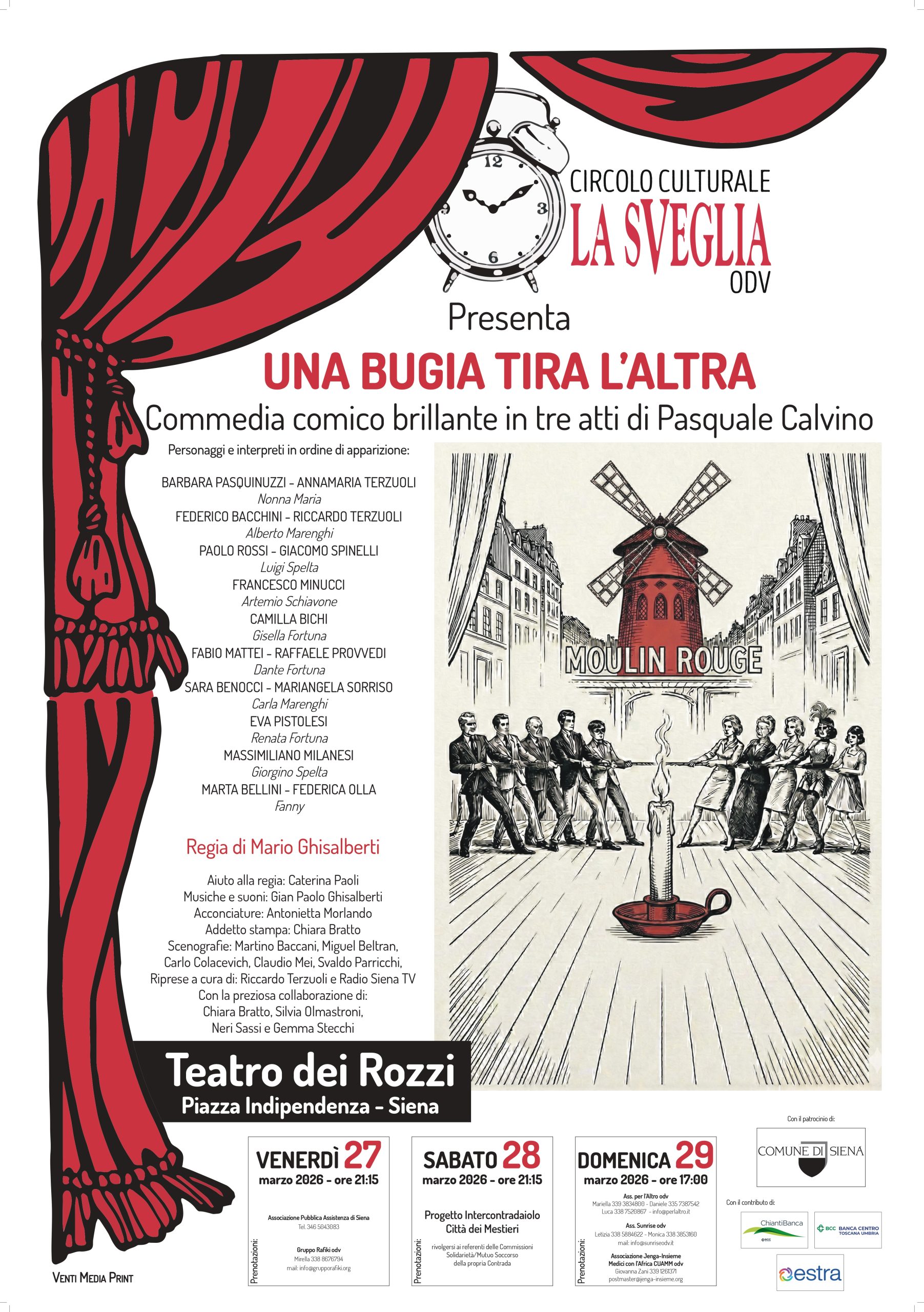 “Una bugia tira l’altra“, la commedia comico-brillante in tre atti di Pasquale Calvino, debutta a Siena al Teatro dei Rozzi, con la compagnia del Circolo culturale La Sveglia il 27 e 28 marzo alle ore 21.15 e il 29 marzo alle 17. La regia è, come sempre, di Mario Ghisalberti, fondatore dello storico gruppo teatrale senese, e l’obiettivo è quello di sostenere alcune realtà del volontariato senese.