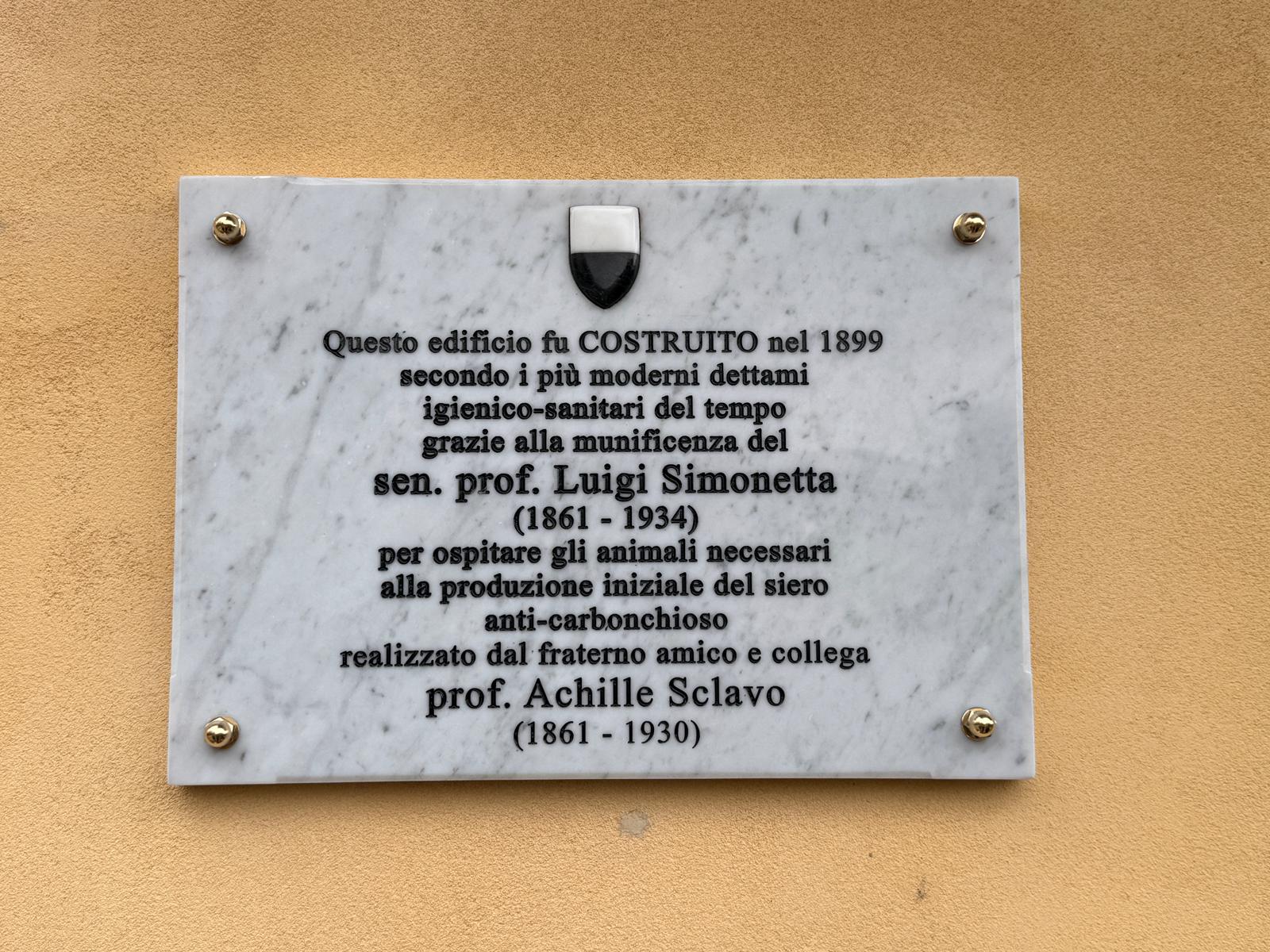 Il testo della targa, come da scambio tra i soggetti proponenti è il seguente: “Questo edificio fu costruito nel 1899 secondo i più moderni dettami igienico-sanitari del tempo grazie alla munificenza del sen. prof. Luigi Simonetta (1861 – 1934) per ospitare gli animali necessari alla produzione iniziale del siero anti-carbonchioso realizzato dal fraterno amico e collega prof. Achille Sclavo (1861 – 1930).” La targa è realizzata comprensiva del logo del Comune di Siena.