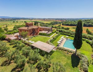 Situata nella frazione di Bettolle, a Sinalunga, la villa è oggi in vendita ad un prezzo di partenza di 2,5 milioni di euro e mandato affidato alla società Building Heritage – Forbes Global Properties, punto di riferimento del mercato Real Estate nel mondo. Di origine settecentesca e classico esempio dell’architettura Leopoldina dei casolari edificati nella campagna Toscana durante il regno del granduca Pietro Leopoldo, la proprietà si compone di 3 edifici distinti: la villa principale, di recente ristrutturazione, la tabaccaia e la porcilaia.