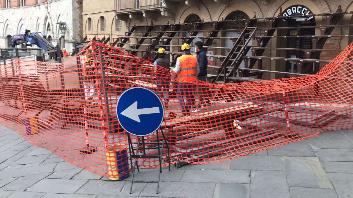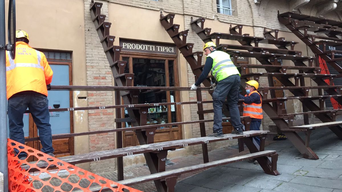 Il montaggio dei palchi al Casato. Un’immagine suggestiva, emozionante e carica di speranza: è questo lo spettacolo che i più mattinieri hanno potuto osservare questa mattina in Piazza del Campo, dove alcuni operai hanno montato il palco del Comune al Casato.