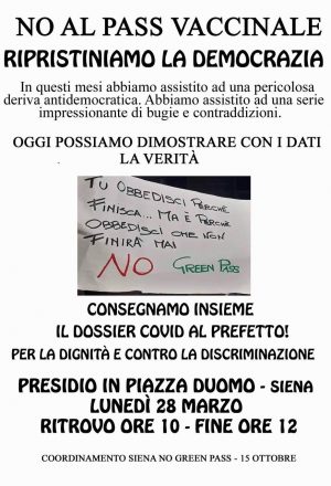 Il Coordinamento Siena No Green Pass 15 Ottobre ha elaborato un appello alle autorità provinciali e regionali per sollecitare la rimozione delle numerose norme anticostituzionali conseguenti all’emergenza COVID.