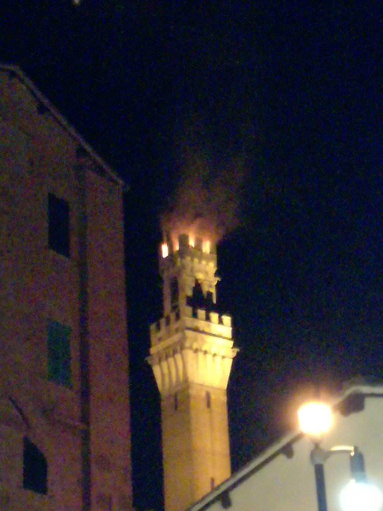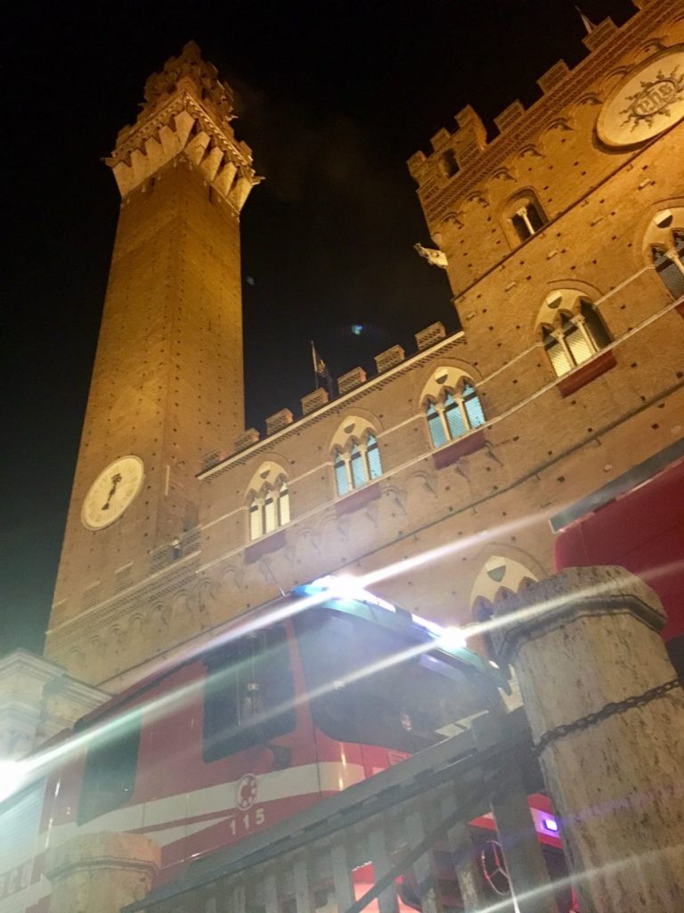 E’ stato spento poco dopo le 1 della notte l’incendio alla sommità della Torre del Mangia. Per oltre un’ora i vigili del fuoco si sono prodigati in un’impresa improba: salire 400 scalini, con due estintori in mano e gli autoprotettori per poter respirare. I primi ad accorgersi dell’incendio nella Torre del Mangia sono stati due vigili urbani liberi dal servizio e un volontario della Croce Rossa: Enrico Petrini, Antonio Cartoni e Giuseppe Giorgiadi. Sono saliti sulla Torre portando gli estintori che trovavano lungo il loro percorso. A loro si è aggiunto un vigile del fuoco, anche lui libero dal servizio. Poi, dopo pochi minuti, in piazza del Campo sono arrivati vigili del fuoco, carabinieri e polizia.