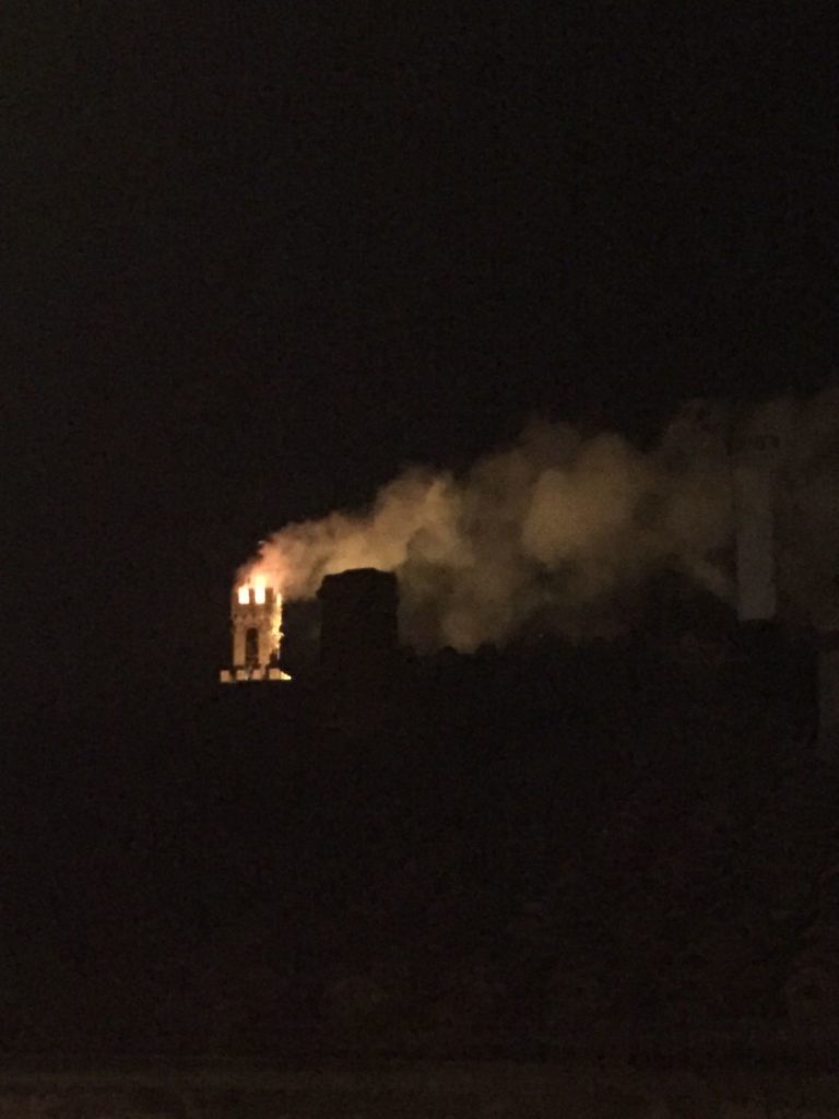 A provocare l’incendio pare sia stata una pignatta accesa sulla Torre, che ha propagato le fiamme al pavimento proprio sotto il campanone.