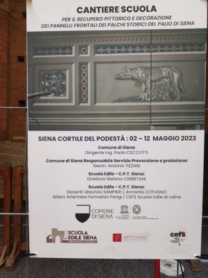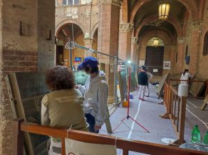 Un ‘cantiere-scuola’ all’interno del cortile del Podestà a palazzo Pubblico a Siena. Un cantiere che tutti i turisti possono vedere da vicino, è quello della Scuola Edile Senese che vede all’opera studenti della scuola francese Artemisia per il restauro del palco delle comparse.