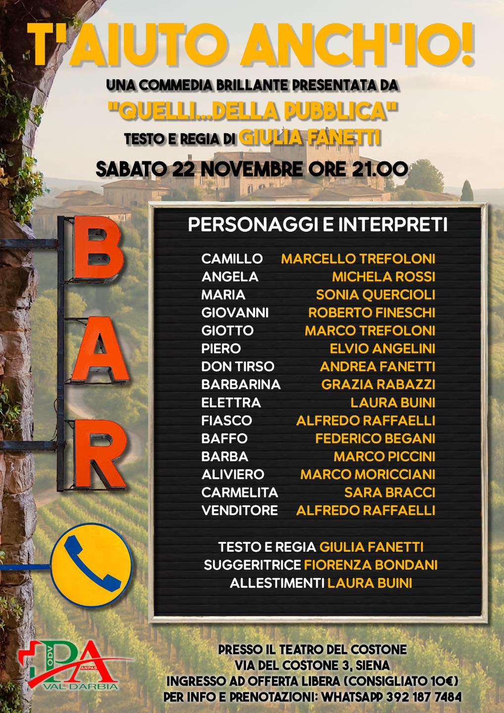 “C’è un borgo toscano – ci anticipano le volontarie e i volontari della Pubblica Assistenza Val d’Arbia – chiamato Borgosiamopoveri dove tra storie, emozioni, colpi di scena e avventure, bisogna riuscire nell’ardua impresa di salvare il bar del paese, casa, cuore e luogo della vita di tutti. L’occasione giusta per scoprire se ci riusciremo è lo spettacolo che si svolgerà al Teatro del Costone e sarà anche l’occasione per sostenere le attività dello Sportello Handy che dal 2010 si occupa di inclusione e disabilità con cura e attenzione verso i bisogni e le fragilità.”