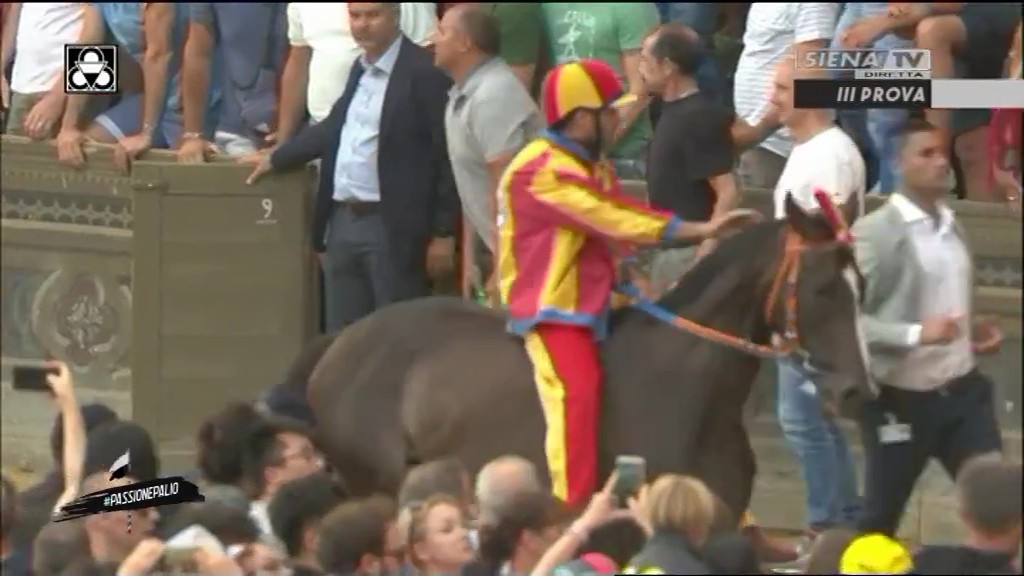 E’ la contrada della Chiocciola con Francesco Caria detto Tremendo su Una per Tutti a vincere la terza prova del Palio del 16 agosto 2019.
