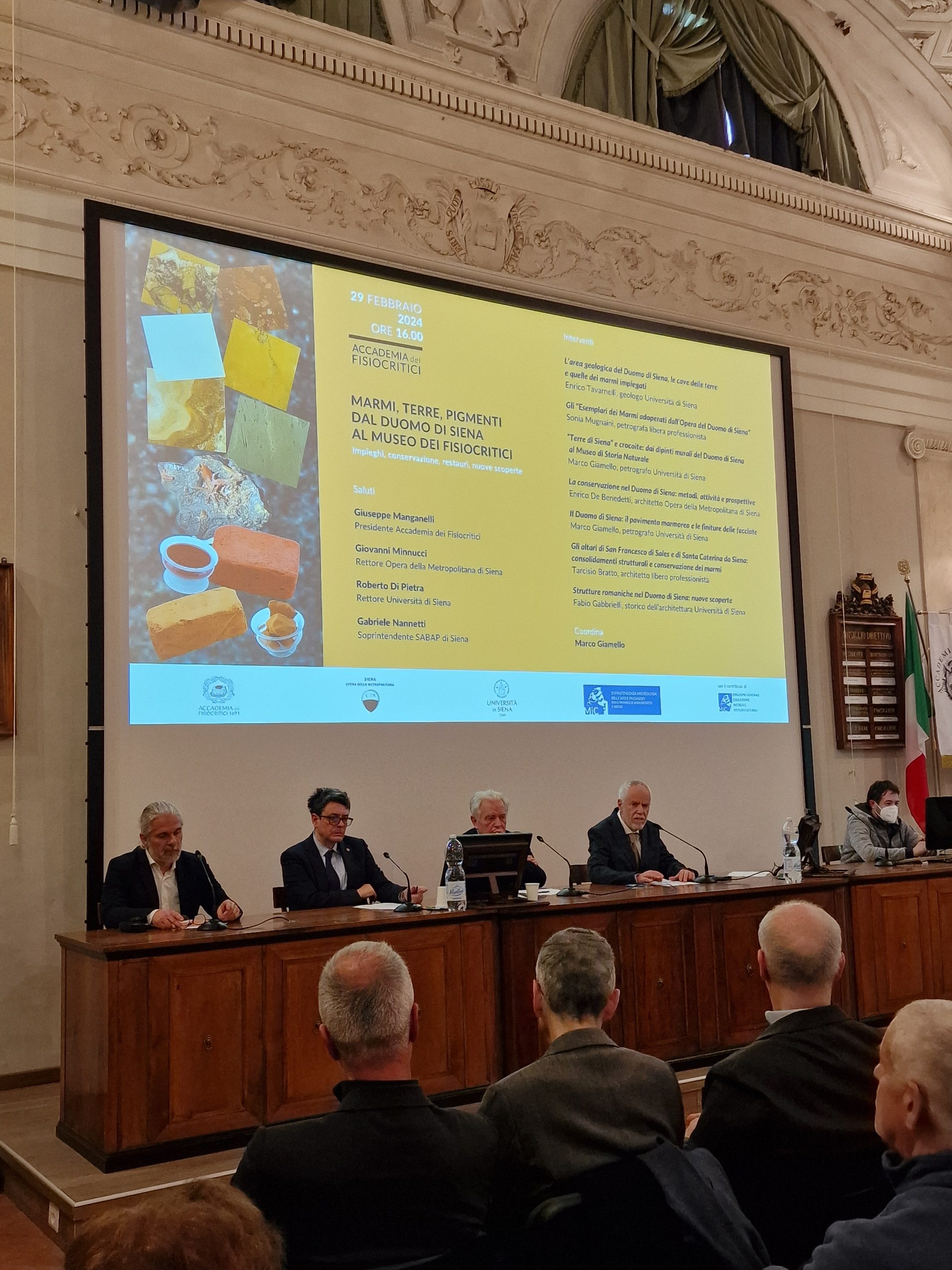 Grande successo per il convegno “Marmi, terre, pigmenti dal Duomo di Siena al Museo dei Fisiocritici: impieghi, conservazione, restauri, nuove scoperte” svolto ieri all’Accademia dei Fisiocritici che ha registrato la partecipazione di un folto pubblico sia nell’aula magna che nella diretta YouTube.